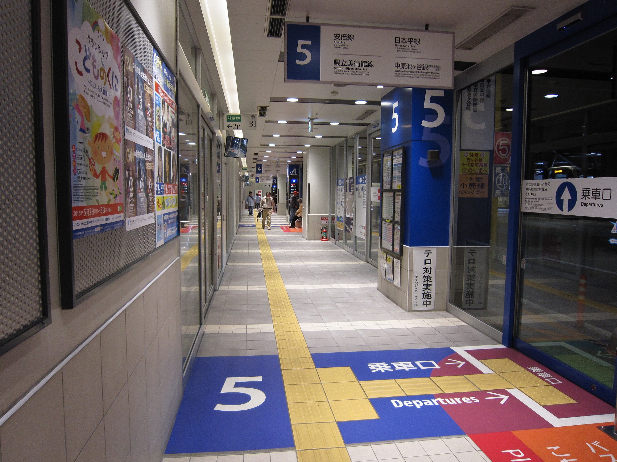 新静岡バスターミナル バス乗り場 3番線・4番線・5番線 バス停と乗り場はガラスで仕切られています
