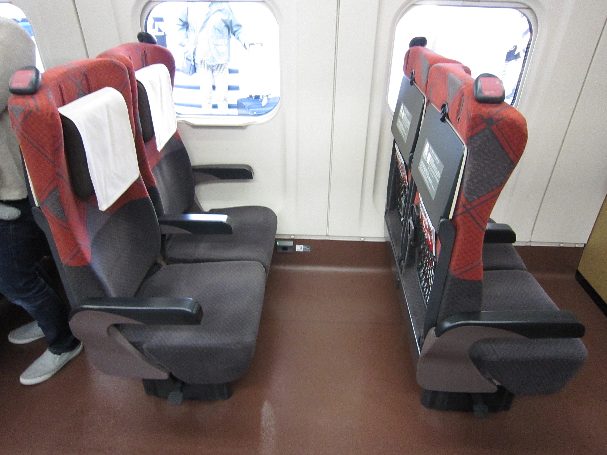 シートは、赤を基調にしています。今までのJR東日本の新幹線と比べて、ヘッドレストがついていて、座り心地もよくなりました。客を詰め込むことしか考えていなかった頃と比べると、随分と進化しました。
