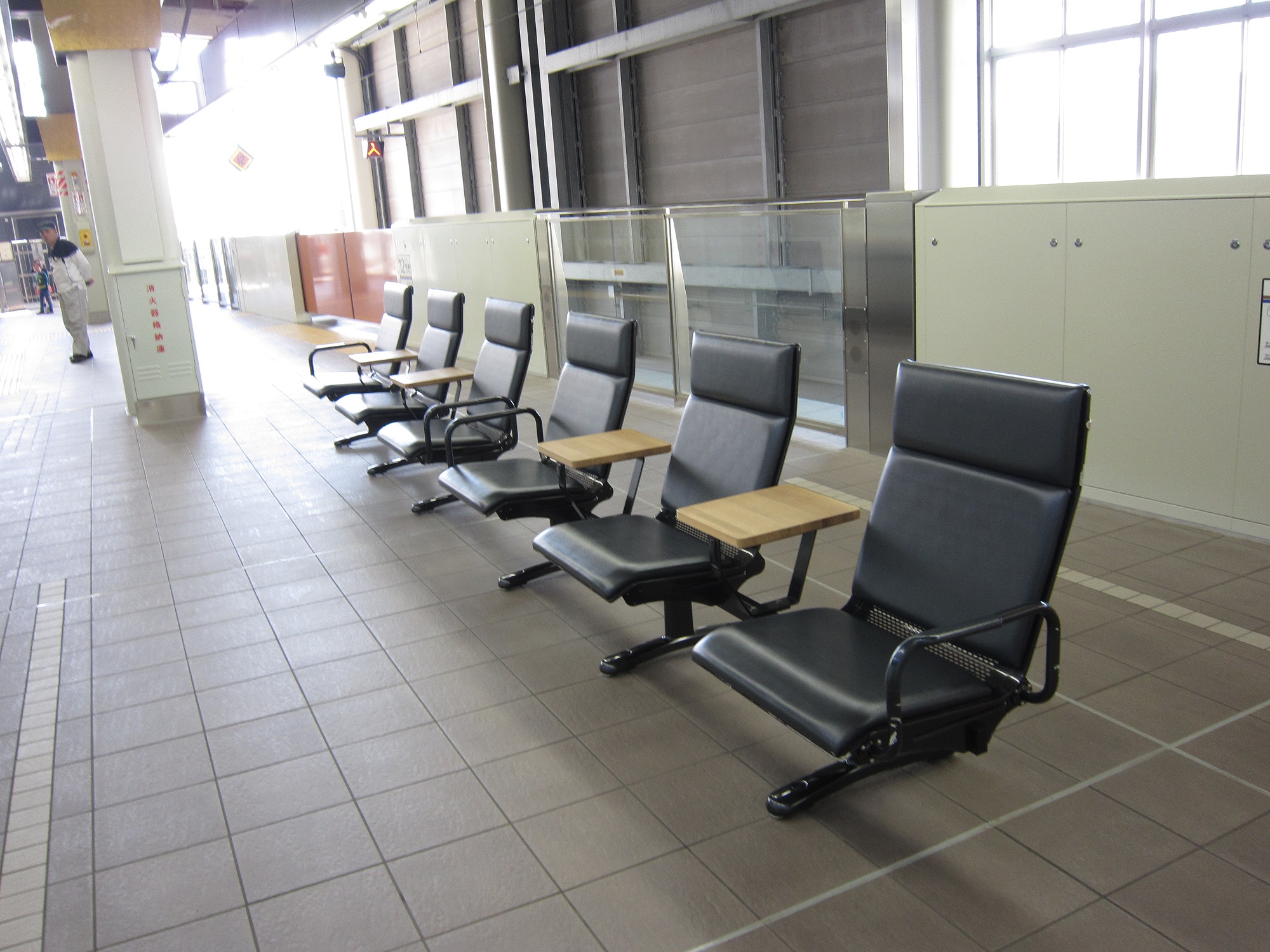 新幹線ホームのベンチです。駅のベンチにしては豪華で、座り心地が良さそうです。