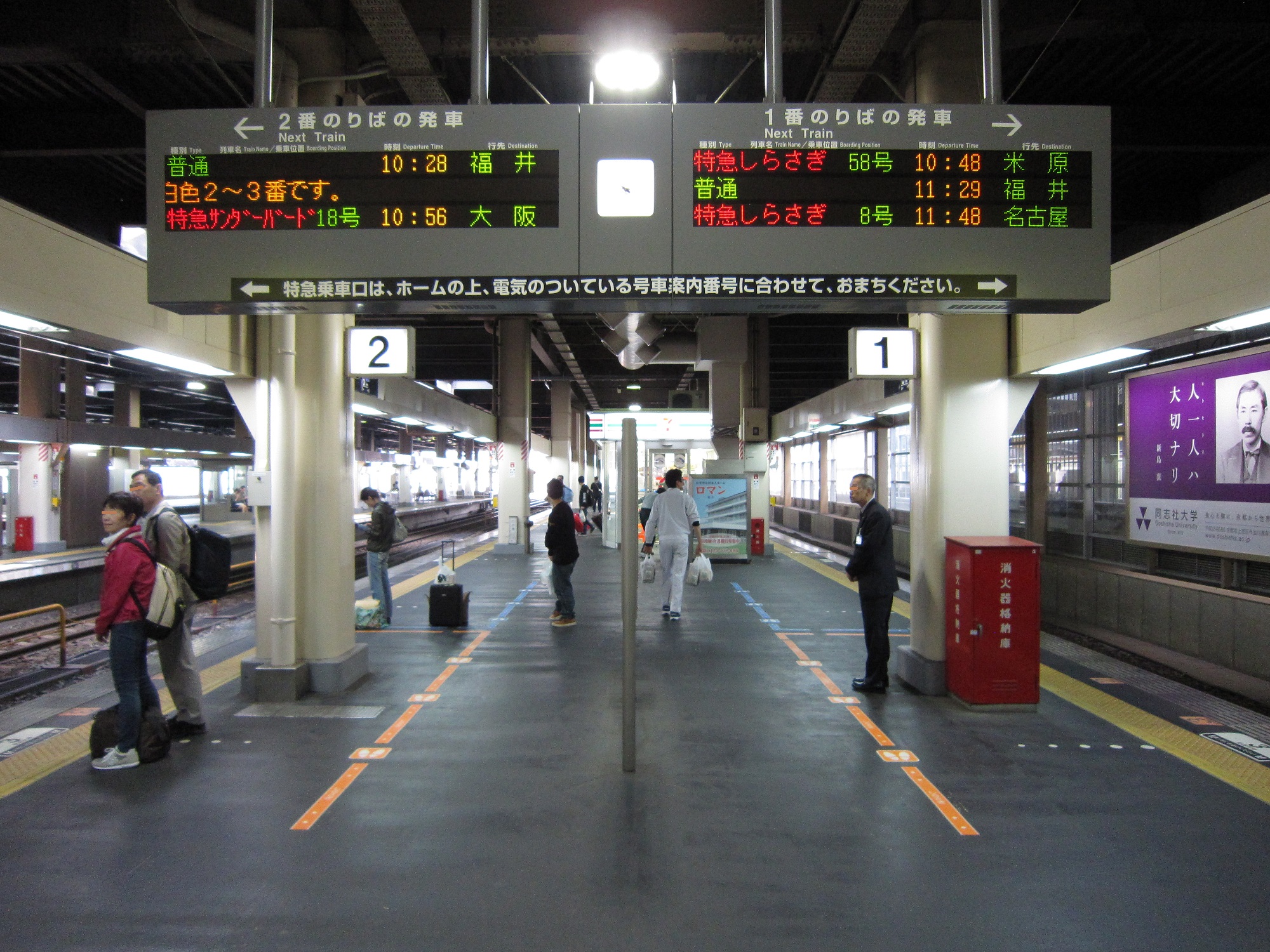 1番線・2番線です。主に、北陸本線の福井、敦賀、米原方面と、更にその先の大阪へ行く特急サンダーバードや、名古屋へ行く特急しらさぎが発着します。