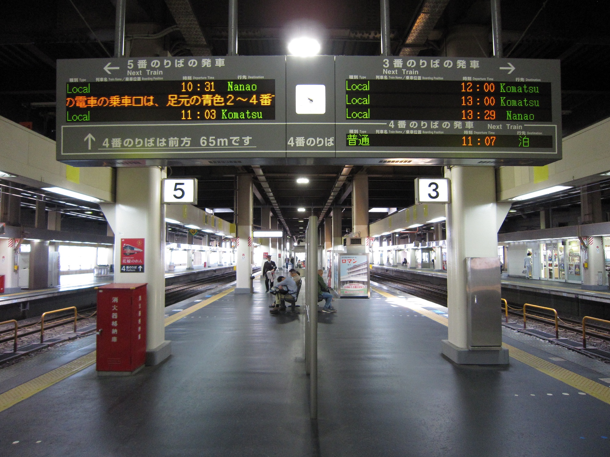 で、4番線はどこにあるのかというと、3番線・5番線の先、富山方向に歩いたところにあります。主に、七尾・和倉温泉方面に行く列車が発着します。