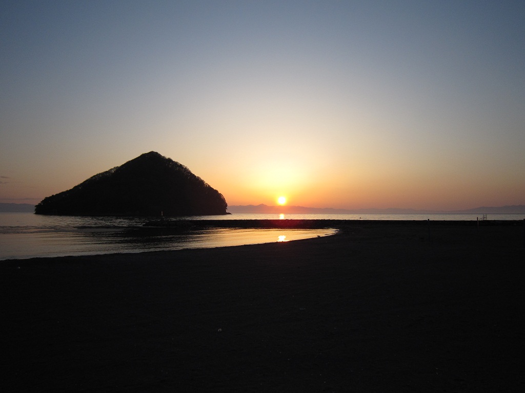 これが、浅虫温泉から見える夕焼けです。浅虫温泉って、写真から向かって左側に見えるのが青森市の市街地でして、遠く先が陸地なので、太陽は海に沈むわけではないのですが、いや確かにきれいですねー