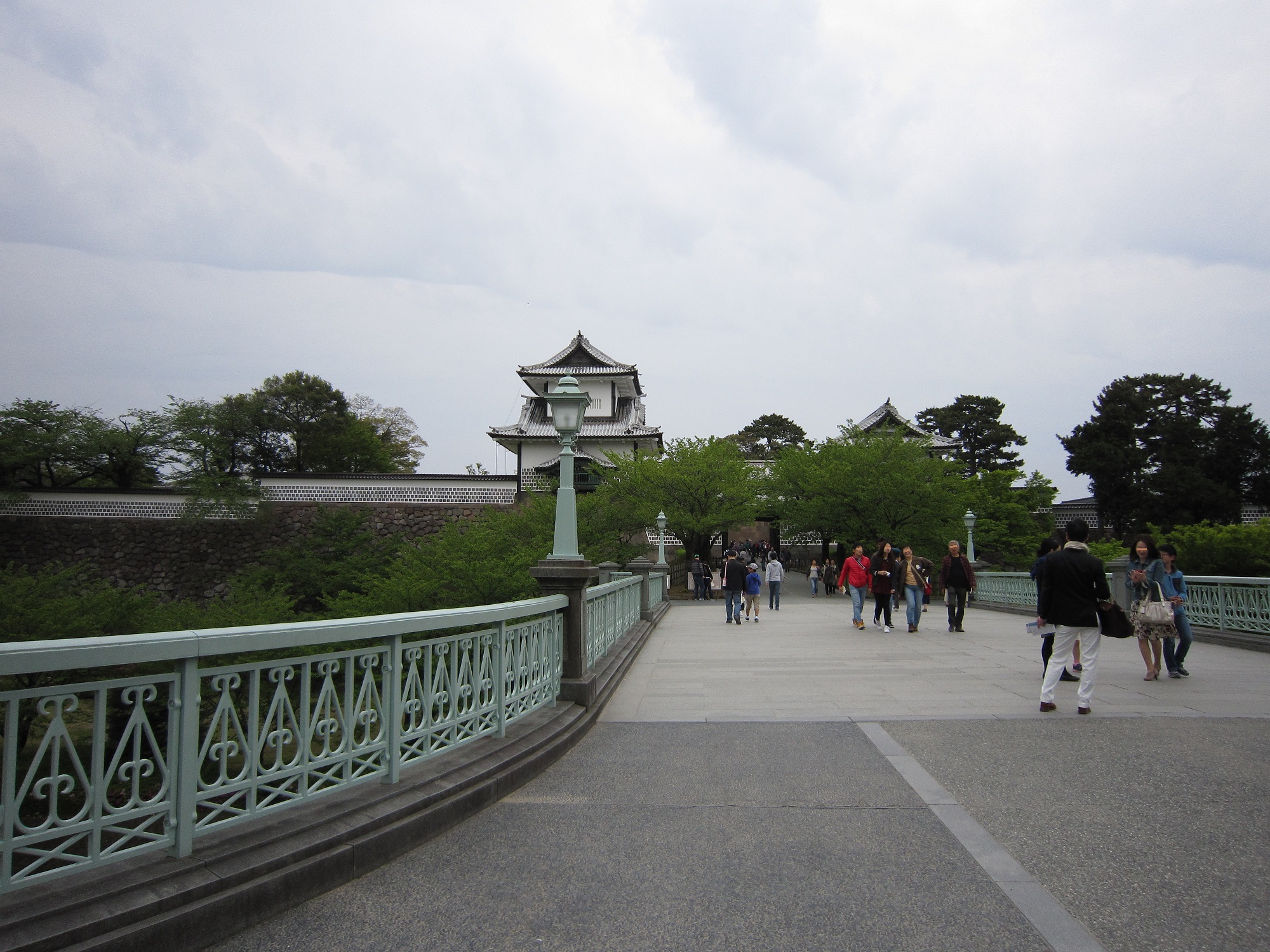兼六園方向から歩くと、緑色の橋があります。この橋を渡った先に、石川門があります。
