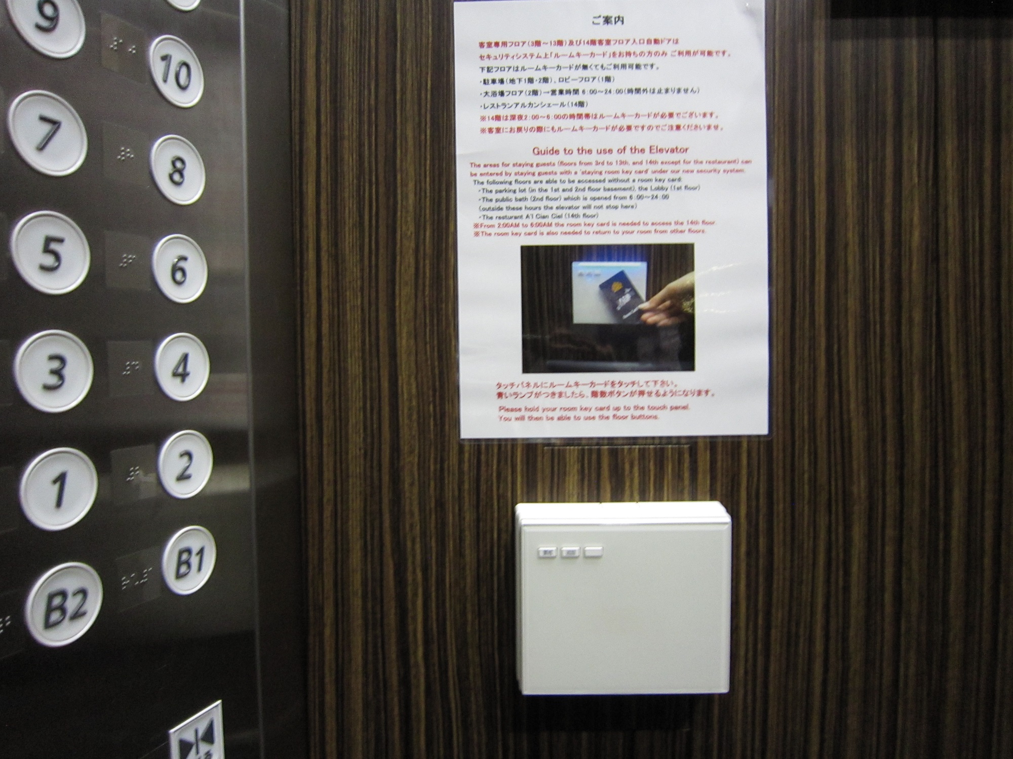 エレベーターにはセキュリティがかかっていまして、客室階へは先にカードキーをタッチしてからでないと、ボタンを押してもエレベーターが止まらない仕組みになっています。