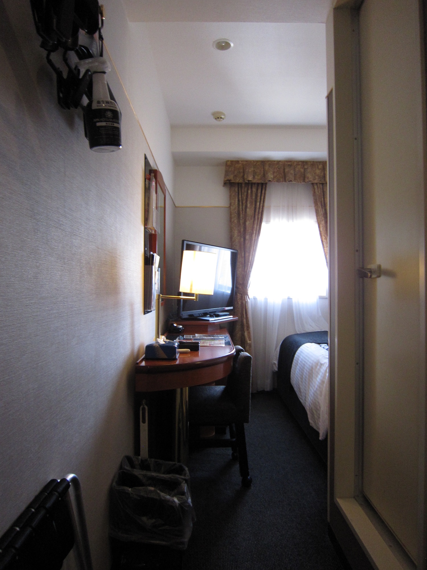 シングルルームです。とにかく狭いです。どれぐらい狭いかと言いますと、デスクに座ると後ろのベッドに椅子が当たりそうになるぐらいの狭さです。