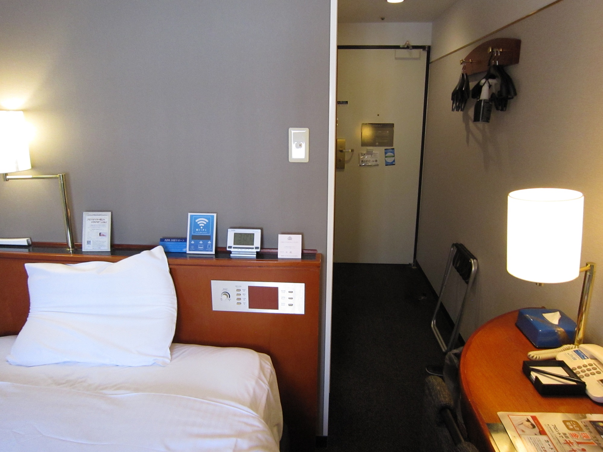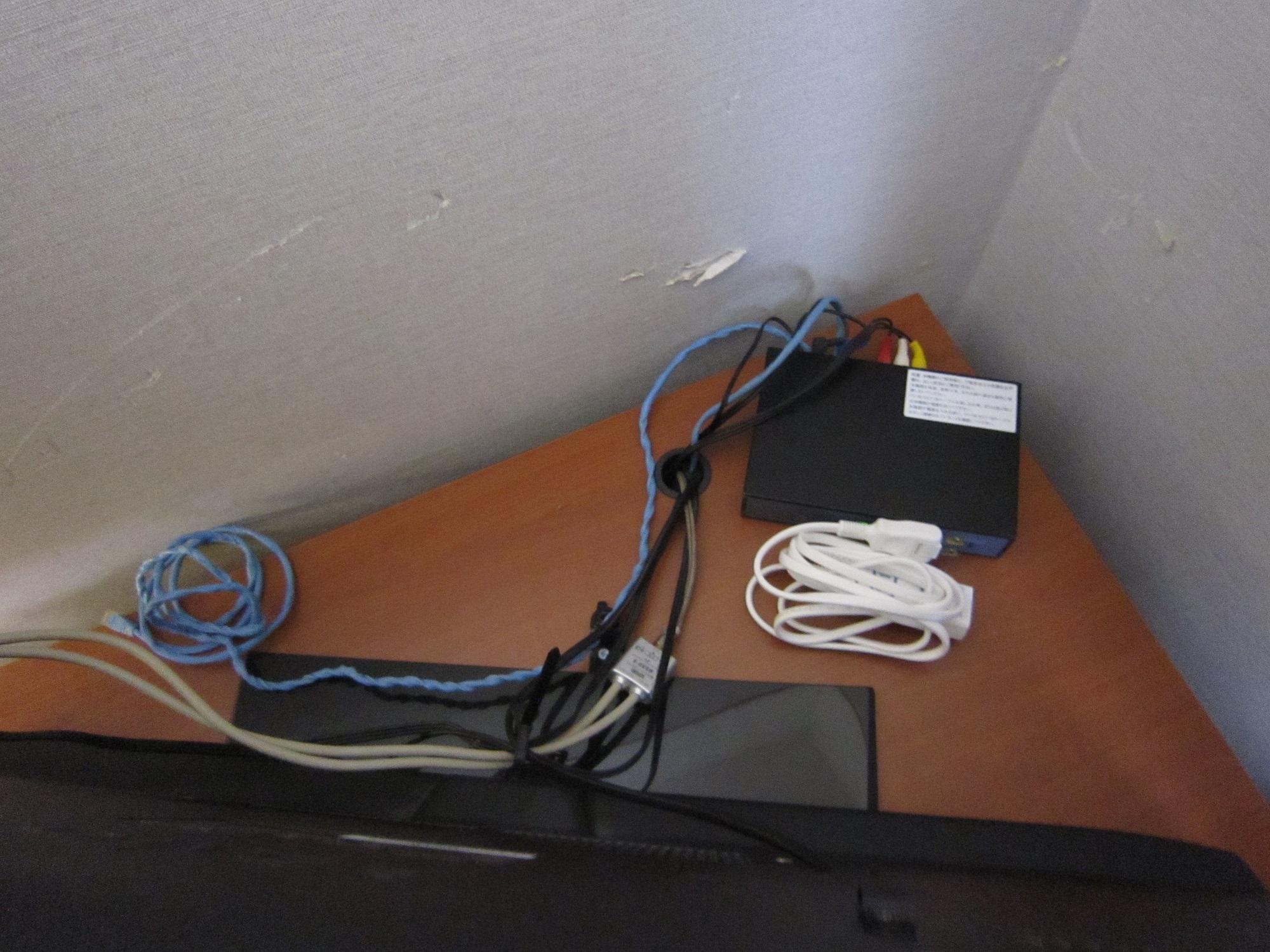 では、有線LANはどこからつなぐのかと思ったら、テレビの後ろにありました。ただし、PCを繋いでみても、インターネットにつながりませんでした。どうやら使用不能になっているみたいです。京都駅堀川通のアパホテルもそうだったので、もしかすると、「インターネットは無線LANでどうぞ」ということかも知れません。確かに、今時無線LAN機能のないノートPCの方が珍しいのかも知れませんが、やはり有線LANが使いたいと思っている方は、注意が必要です。