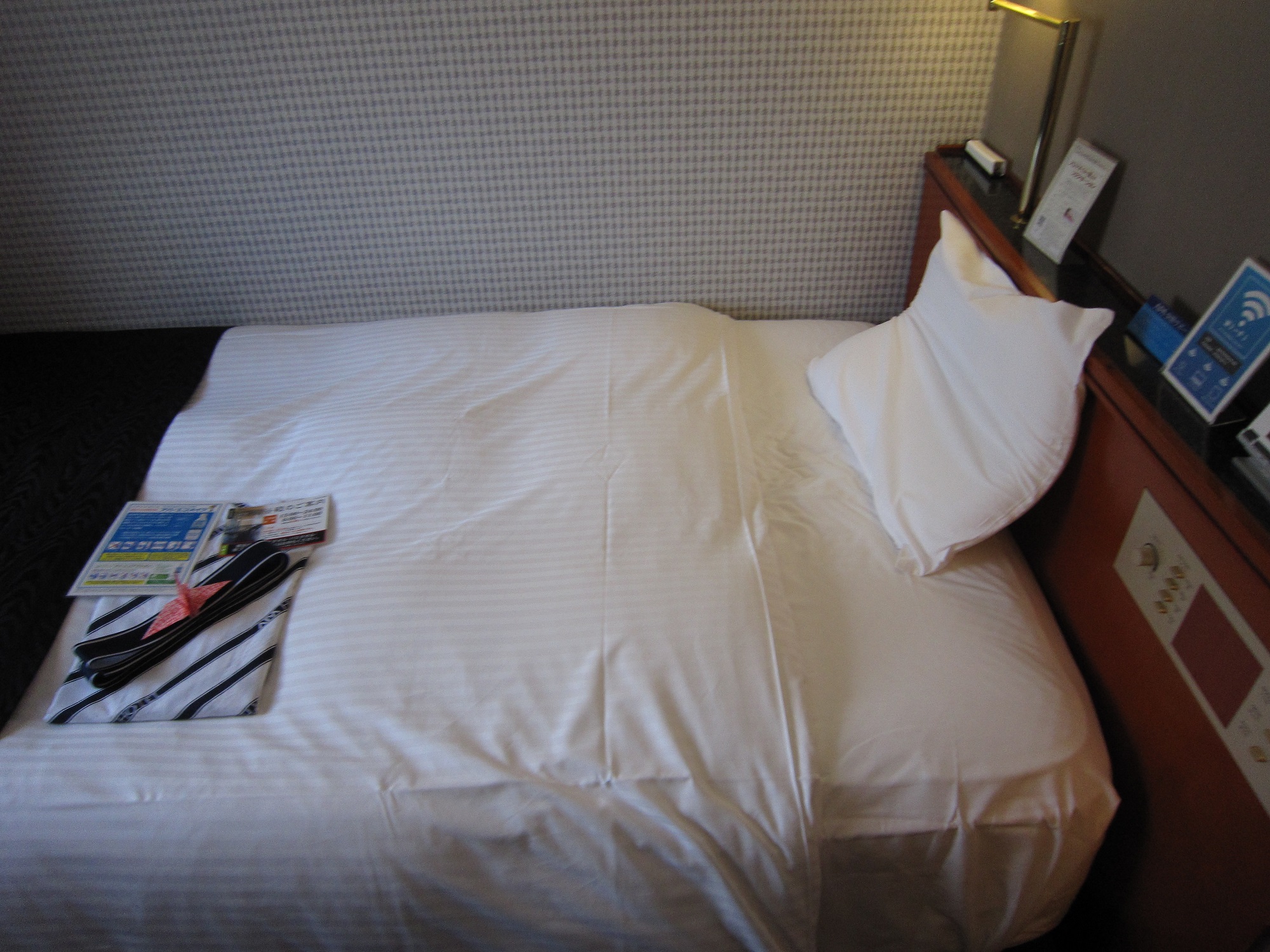 マットレスも心地よく、寝心地はとっても良かったです。ベッドの上には浴衣と、大浴場の案内が置いてあります。