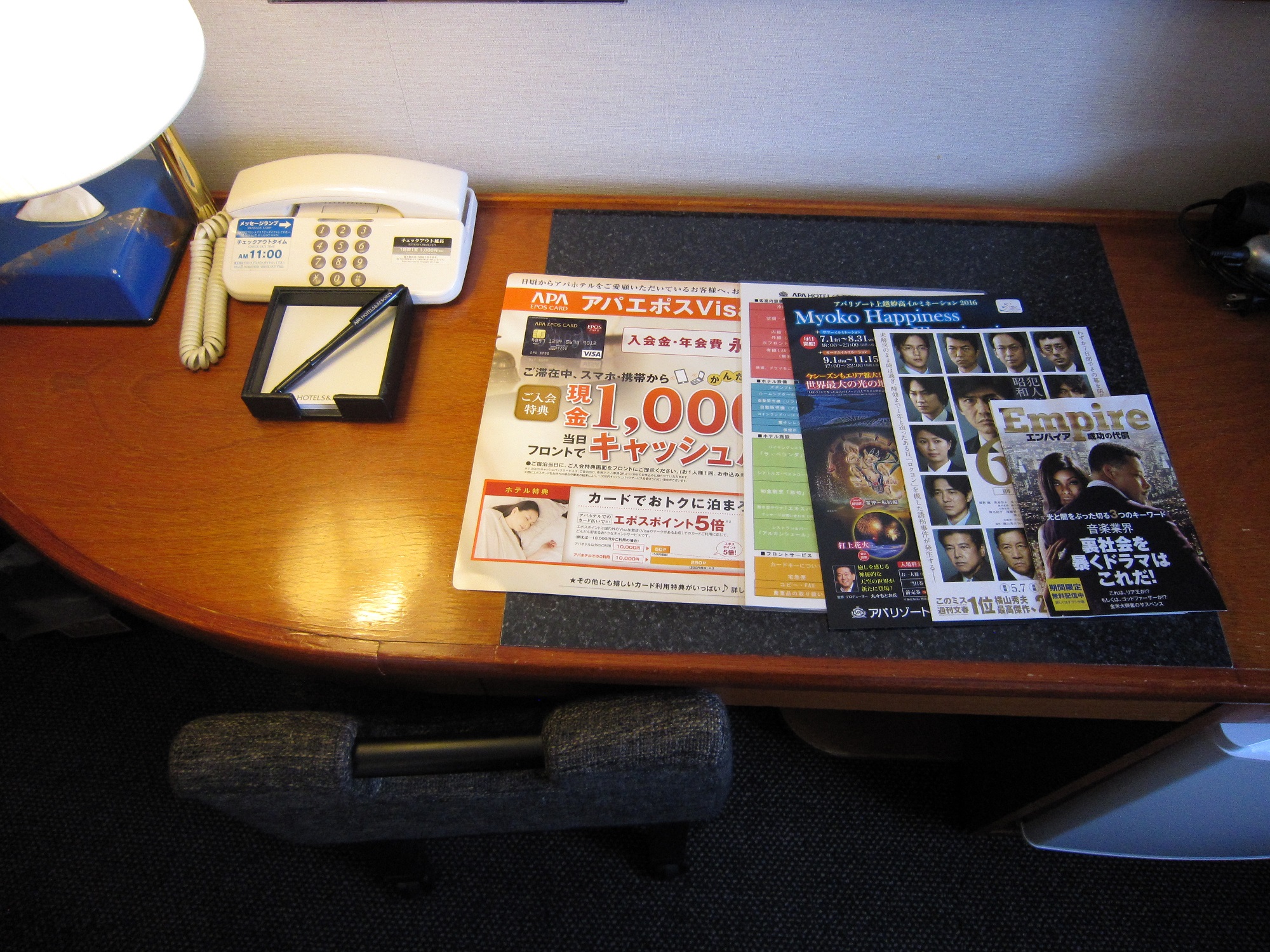 デスクの上は、こんな感じ。邪魔だったのがEPOSカードの入会案内で、これが意外に大きく、入れるスペースがなくて困りました。せめて、鏡の横のマガジンラックに入る大きさにして欲しかったです。