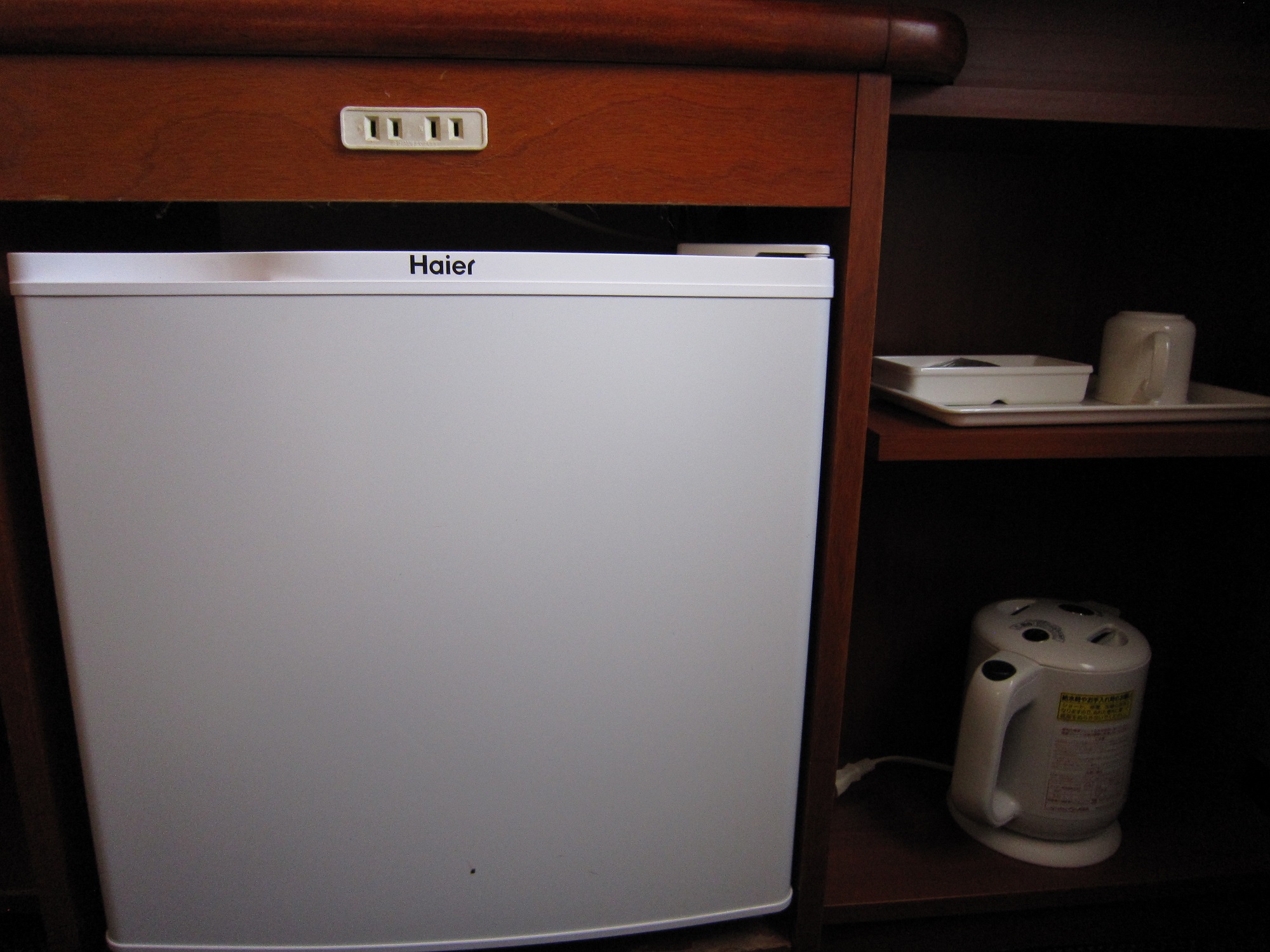 ・・・で、コンセントはどこにあるのかと思ったら、冷蔵庫の上にありました。数が少なく、使い勝手が良くないと気付いているのか、各部屋にテーブルタップが置いてありました。また、冷蔵庫は空です。冷蔵庫の隣には、ポットが置いてあります。