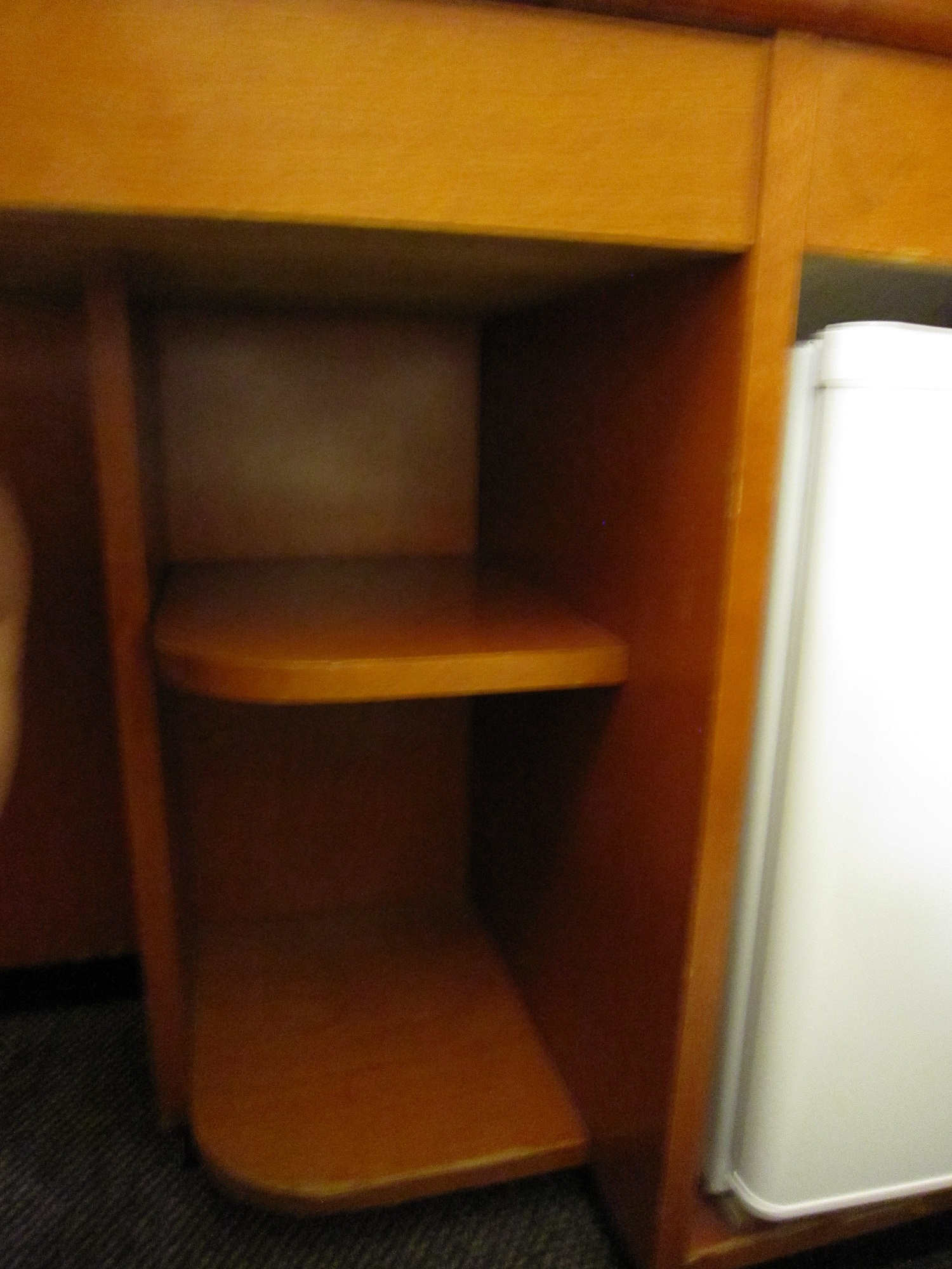 どうにも邪魔なのがこれ。テーブルの下にある棚です。ちょうどテーブルの上の大理石調パネルにPCを置くと、すぐ下にこれがあるので、何度も足をぶつけました。これ、絶対大理石調パネルを張り付けるときの設計ミスでしょう。棚を避けて張るか、棚を撤去するかしないとダメですね。