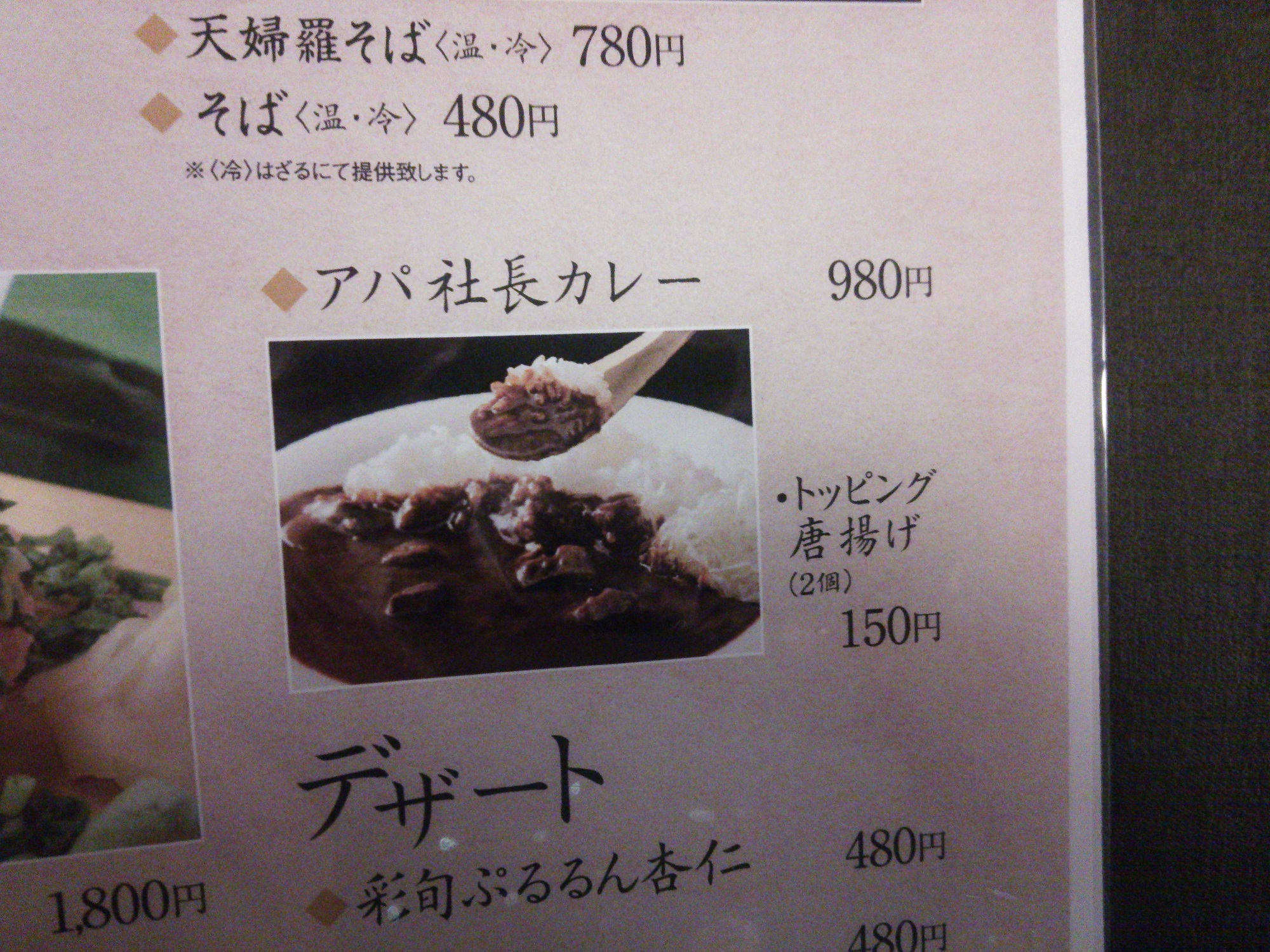 参考までに。こんなメニューがありました。アパ社長カレー980円です。ちなみにアパ社長カレー、レトルト入りを380円で売っています。金沢駅前のスーパーに行くと、ゴーゴーカレーとアルバのレトルトカレーを売っていまして、そのうちアパ社長カレーも売り始めるかも。ともあれ、天ぷらそばが780円、普通のそばが480円なのと比べると、割高に感じます。
