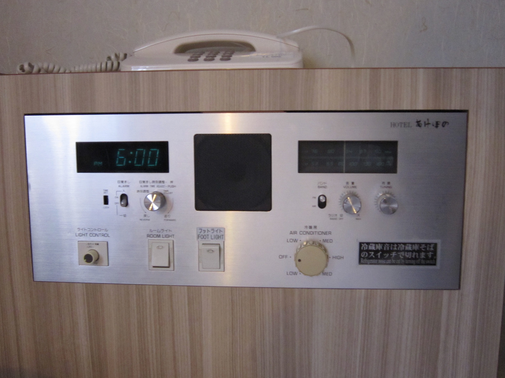 このホテルが建った時代を物語っているのが、ベッド脇にあるコントロールパネルです。目覚まし時計と空調、スイッチは現役です。ただし、ラジオが聞こえるかどうかは試していません。