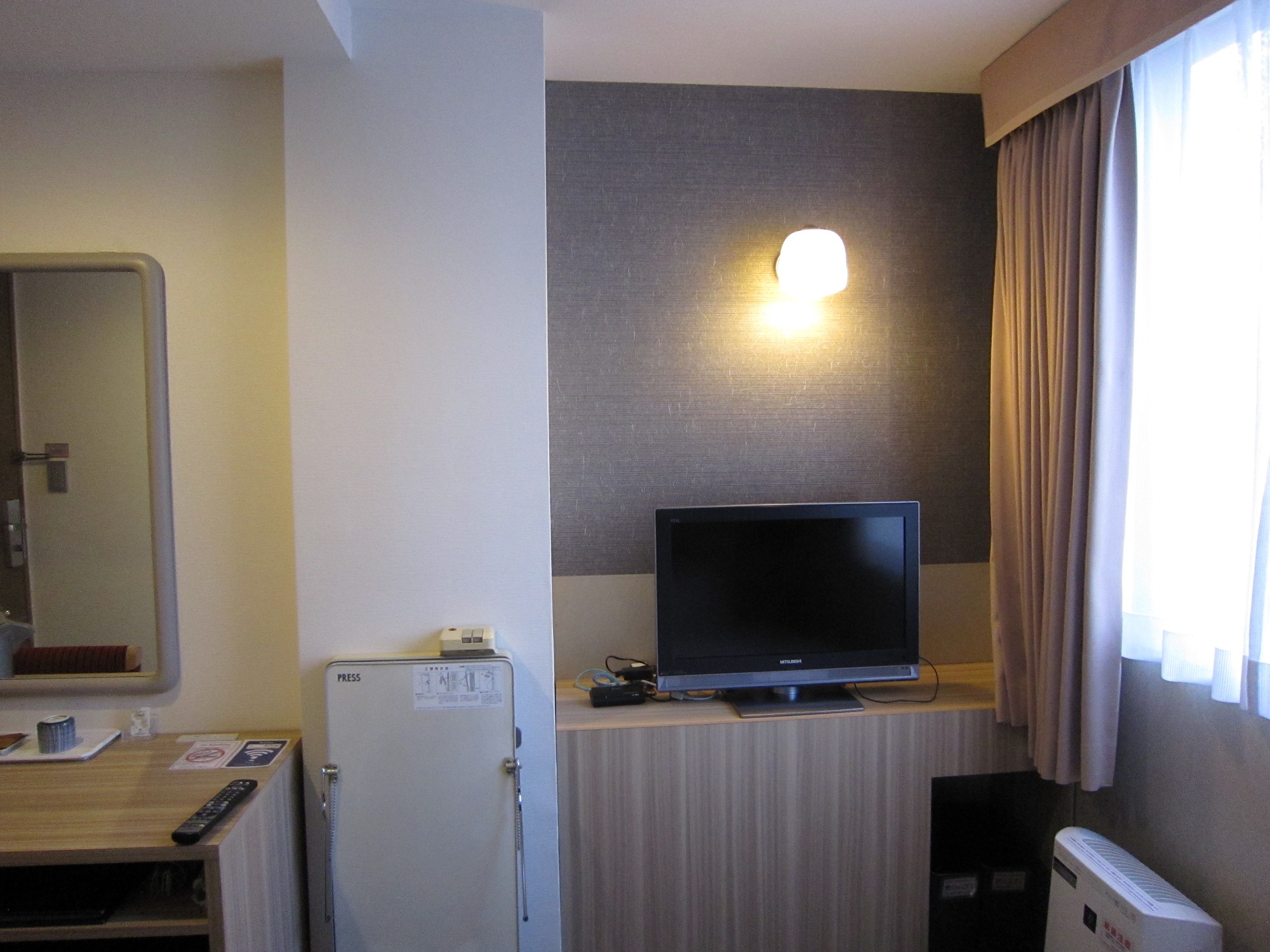 ベッドの反対側には、テレビと加湿空気清浄機、ズボンプレッサが置いてあります。シングルルームにしては広めの部屋なので、テレビが小さく見えます。加湿空気清浄機が付いているのはポイントが高いと思います。