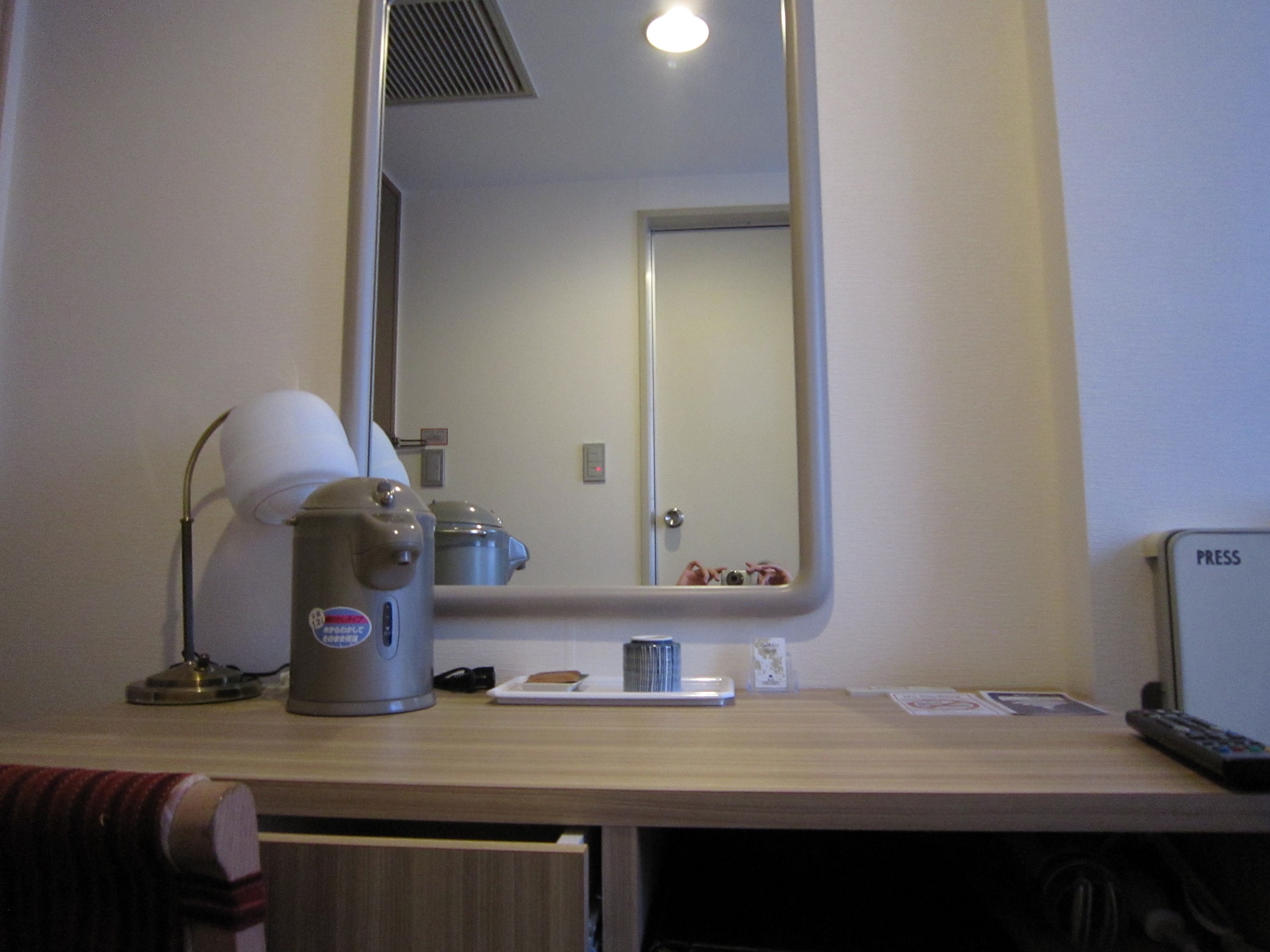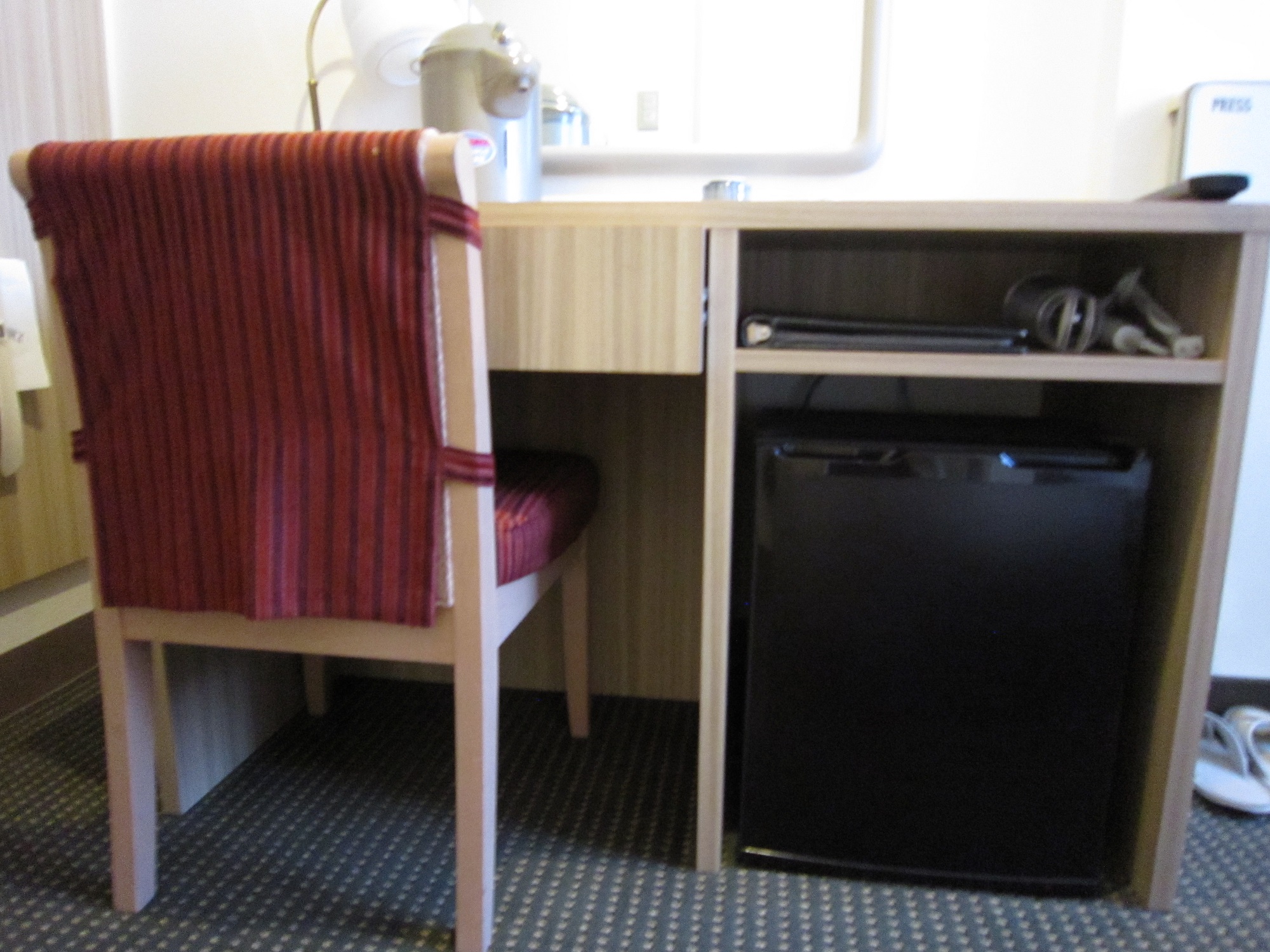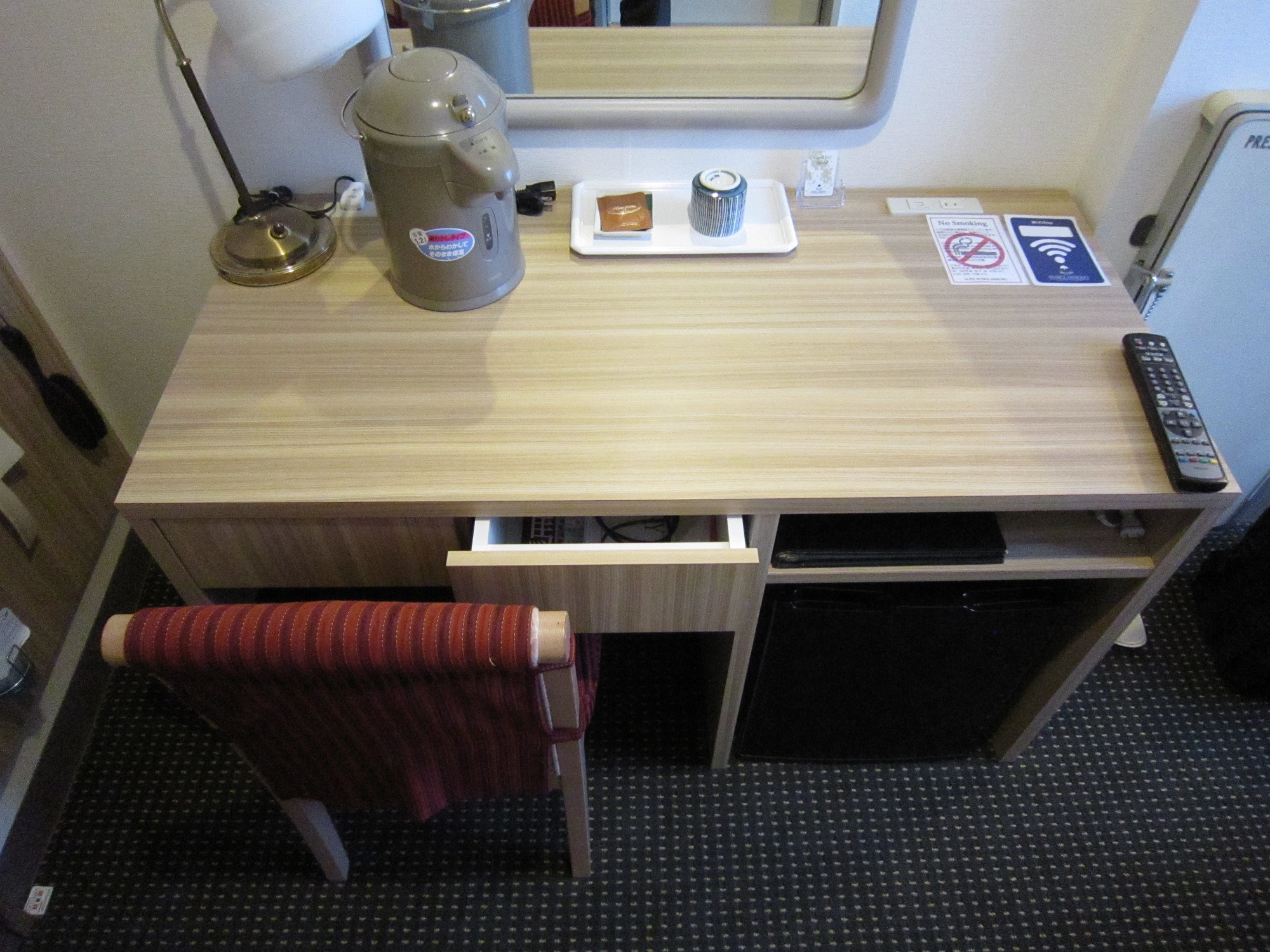 デスクです。前述のとおり、扉の真横にあります。デスクの上には、スタンドと電気ポットがおいてあります。また、最近のホテルだと、玄関脇の挿入口にカードキーを入れないと電気が付かないところが結構あるのですが、このホテルにはカードキー挿入口がありません。このため、特に何もしなくても電気が付くのですが、何気にカードキーをどこに置くか困ってしまいます。このため、デスクの上にカードキー置き場があります。