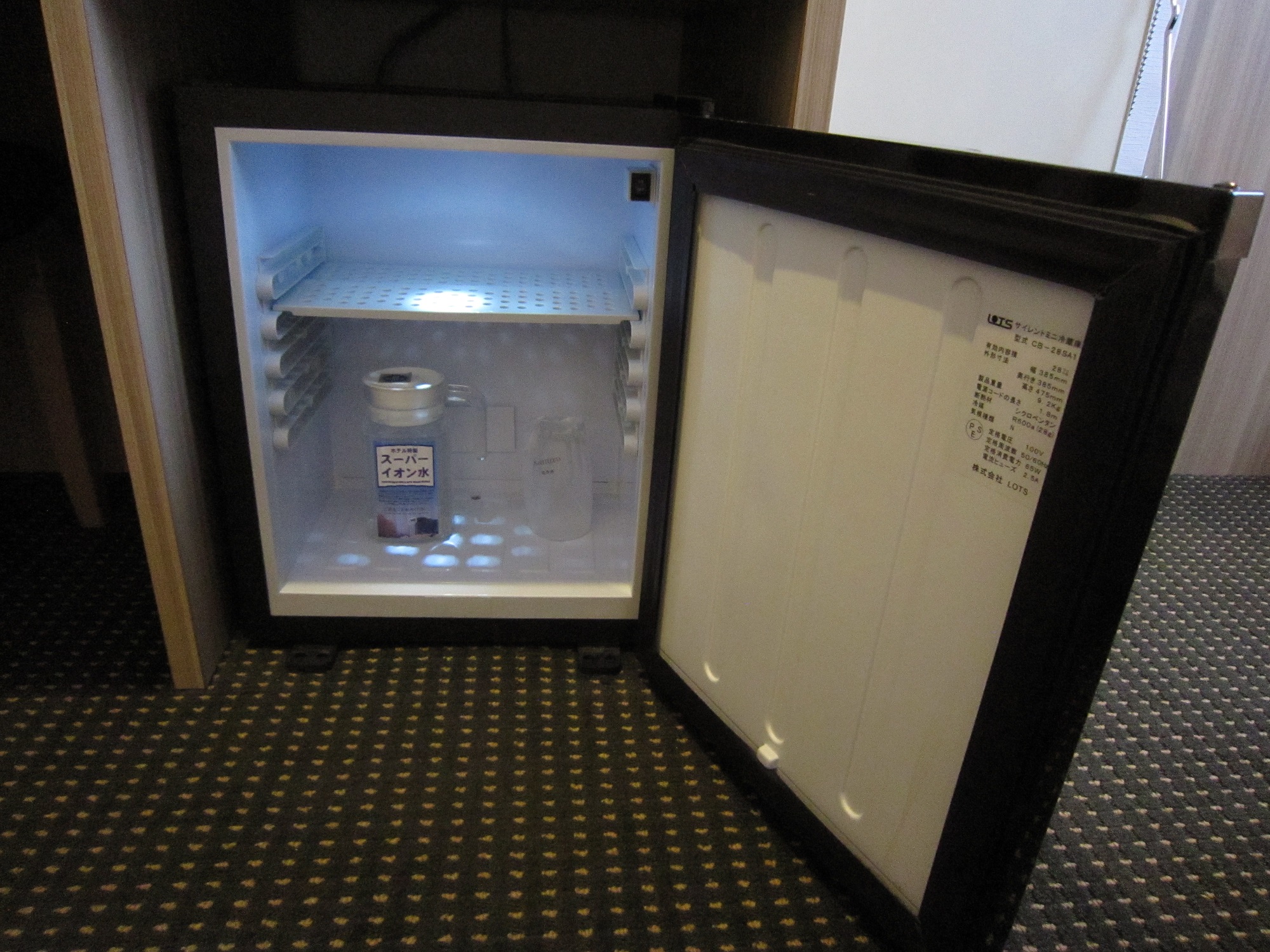 ホテル リバージュアケボノ 本館 シングルルーム 冷蔵庫の中身 ホテル特製スーパーイオン水が入っています