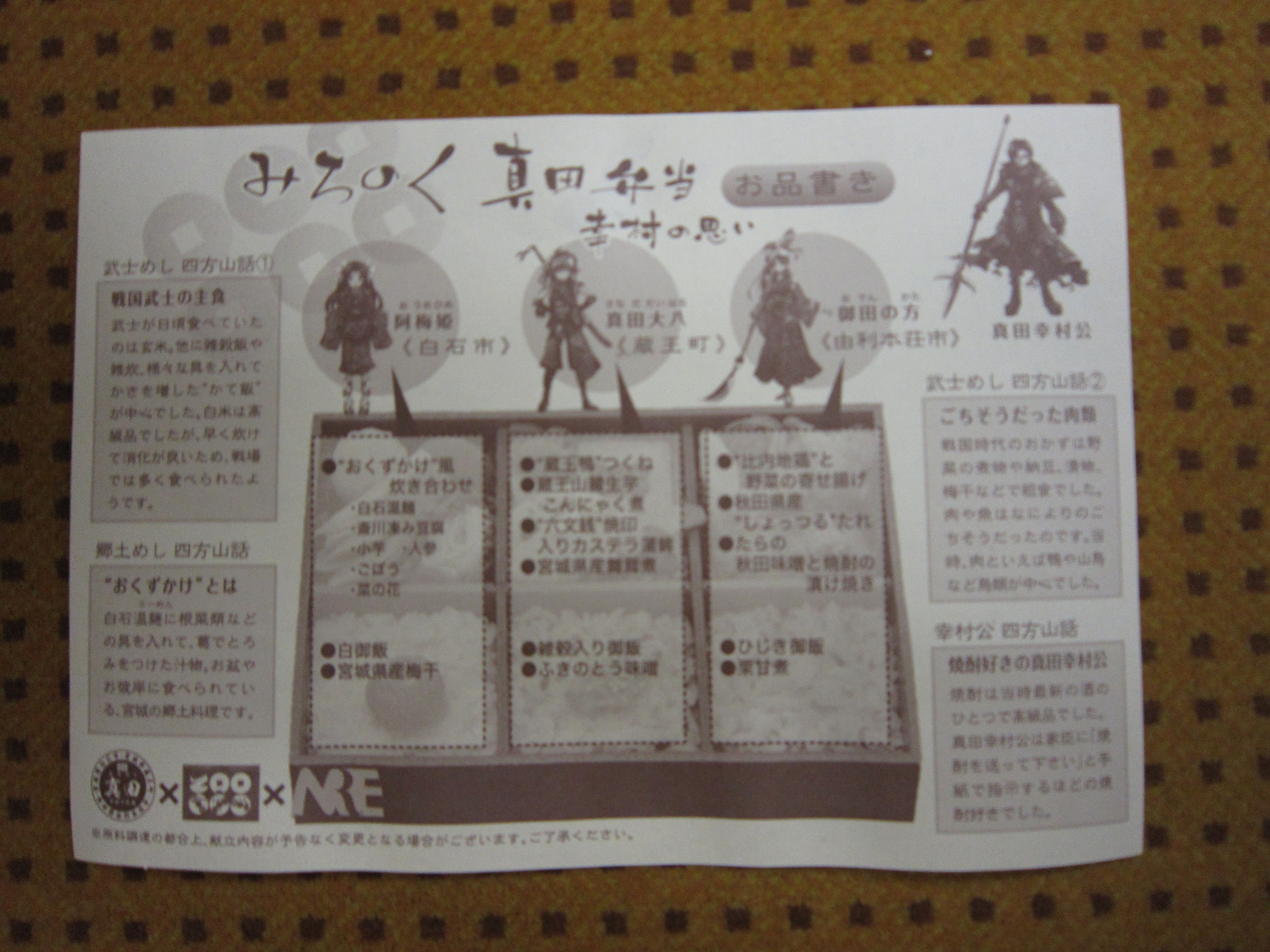 新幹線の中で食べる駅弁を買っておきます。どれにしようか迷ったのですが、これになりました。「みちのく 真田弁当 幸村の思い」なる駅弁です。お値段は1,100円でした。