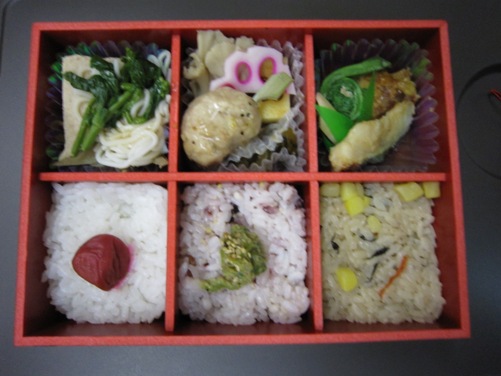 お品書きを見てみますと、一番左が白石市ということで、”おくずかけ”風炊き合わせと白ご飯、宮城県産梅干し。真ん中が蔵王町ということで、つくね、こんにゃく煮、カステラ蒲鉾、宮城県産舞茸煮と雑穀入りご飯、ふきのとう。一番左が由利本荘市で、比内地鶏と野菜の寄せ揚げ、秋田県産しょっつるだれ、鱈のつけ焼きとひじきご飯と栗甘煮だそうです。