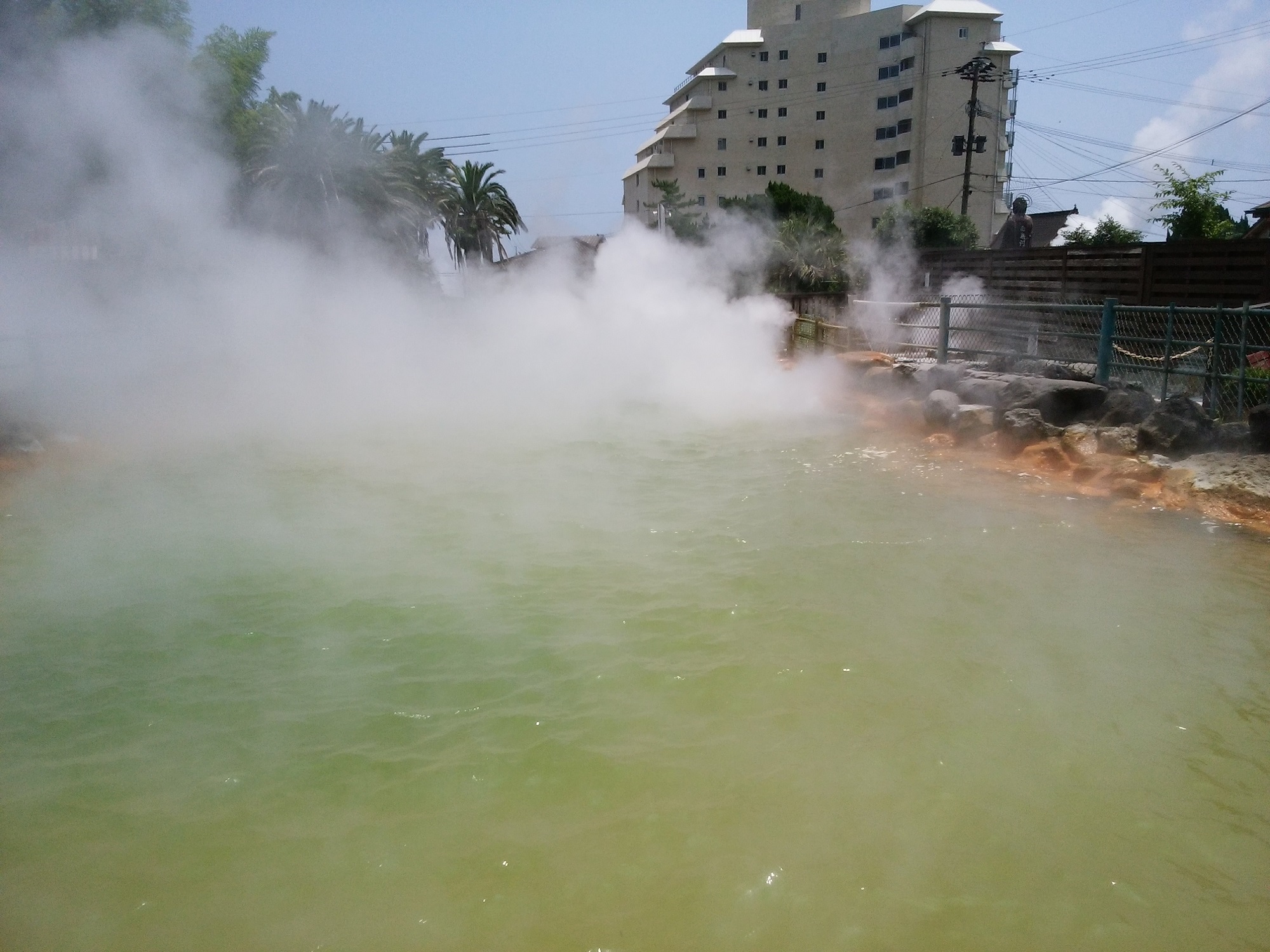 こちらも、約90℃の熱湯。しかも、蒸気がもうもうと噴出しています。夏の鉄輪温泉であることも相まって、これは相当な暑さです。