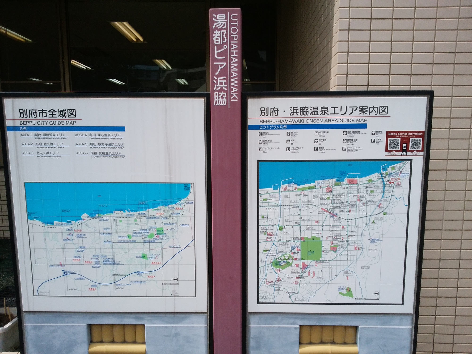 湯都ピア浜脇に着きました。別府市全体図と、別府・浜脇温泉エリアの案内図です。別府って市内各所に温泉がありまして、別府温泉って一体どこからどこまでが別府温泉なんでしょう?