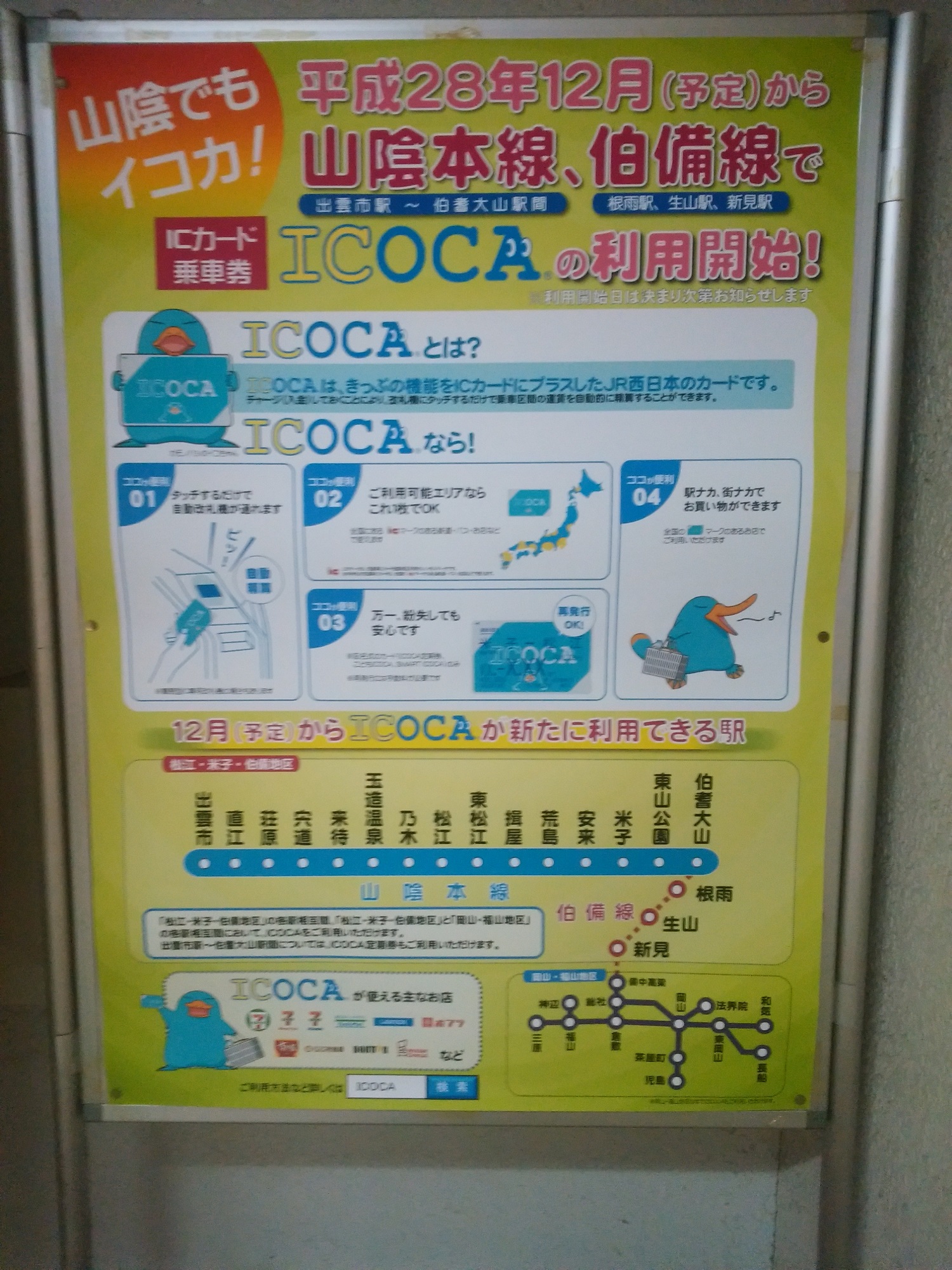 なんと、山陰本線にもICOCAが導入されるそうです。区間は伯耆大山-出雲市と、伯備線の一部駅です。どうやら、岡山・広島方面からICOCAでそのまま行けるようになるみたいです。なので、自動改札機のない松江駅は、そろそろ見納めになるかも。あ、もちろんSuicaやPASMOなどのICカードも使えますよ。