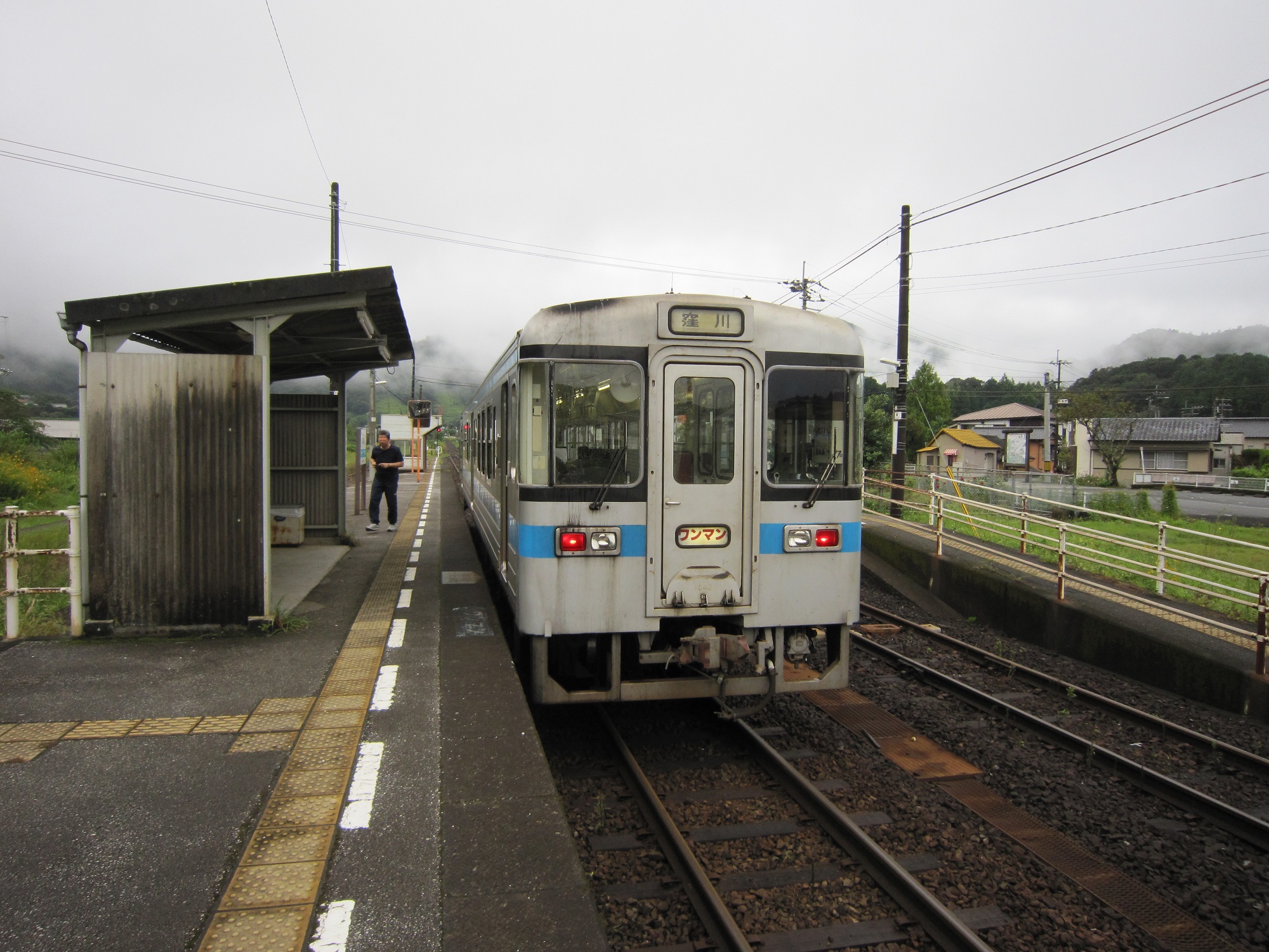 まずは土讃線で、窪川駅を目指します。この日は曇り。時折雨がぱらつく天気で、山にはもやがかかっています。高知市内を出ると、須崎駅の手前までこんな感じの風景が延々と続きます。