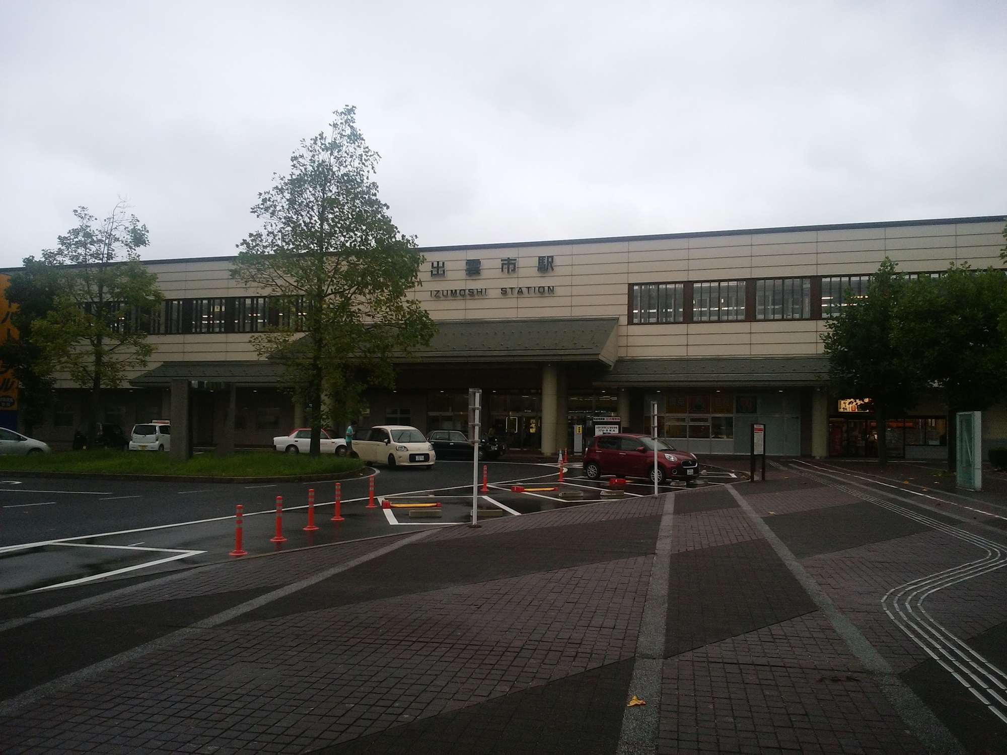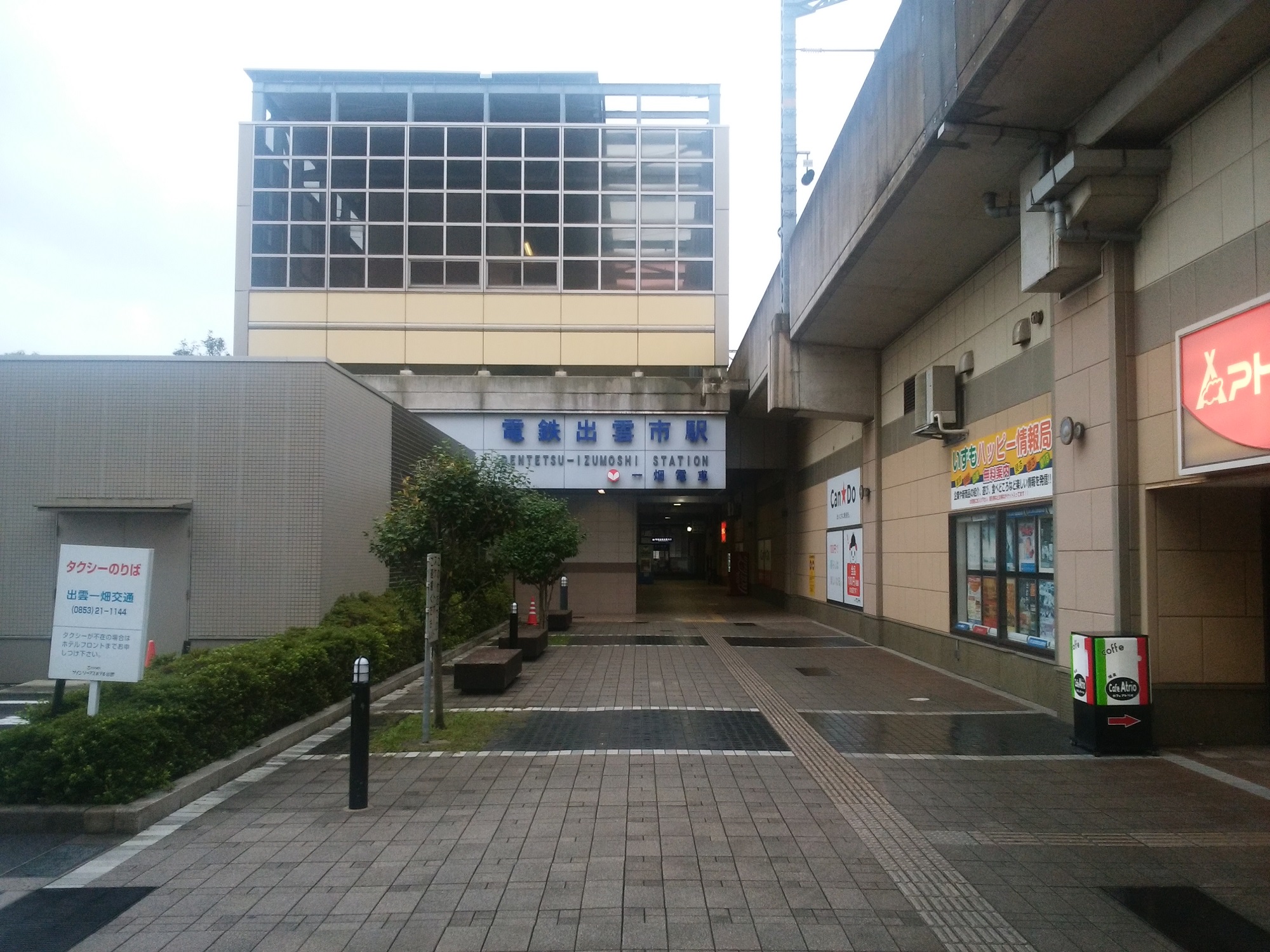 北口です。出雲大社を模した出口ですね。こちらが出雲大社に近い方の出口でして、駅前には出雲大社方面行きをはじめとして、バスターミナルとタクシー乗り場があります。