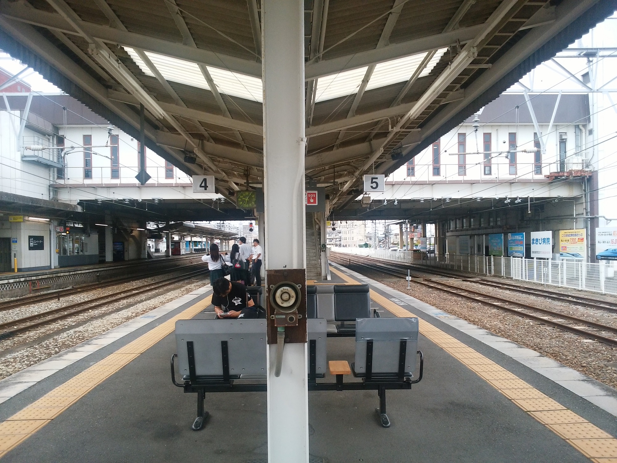 伯備線のホーム、4番線・5番線です。4番線は松江出雲市方面に行く特急やくもをはじめ、総社・備中高梁・新見方面に行く列車が発着します。5番線は、主に岡山方面に行く列車が発着します。