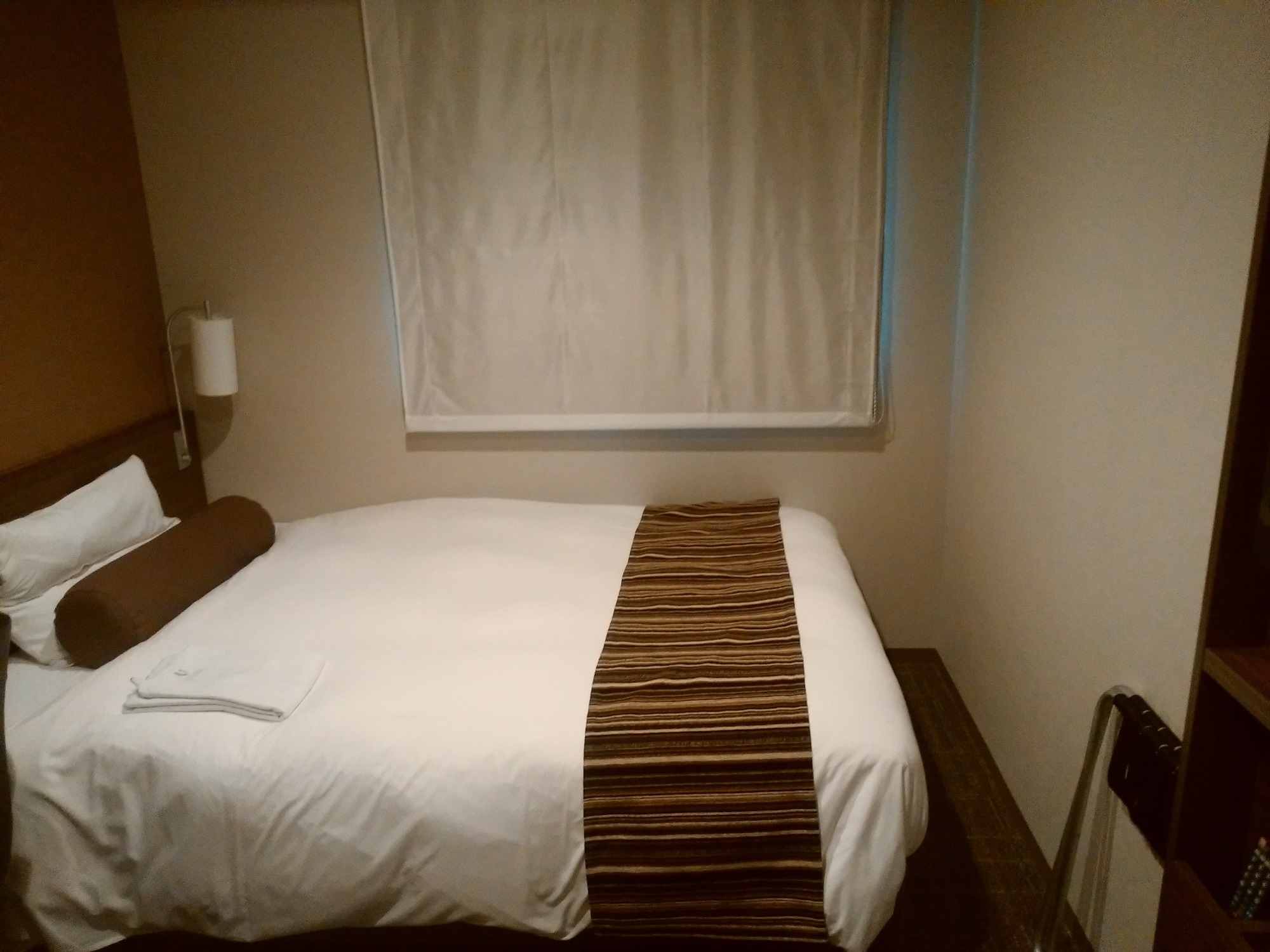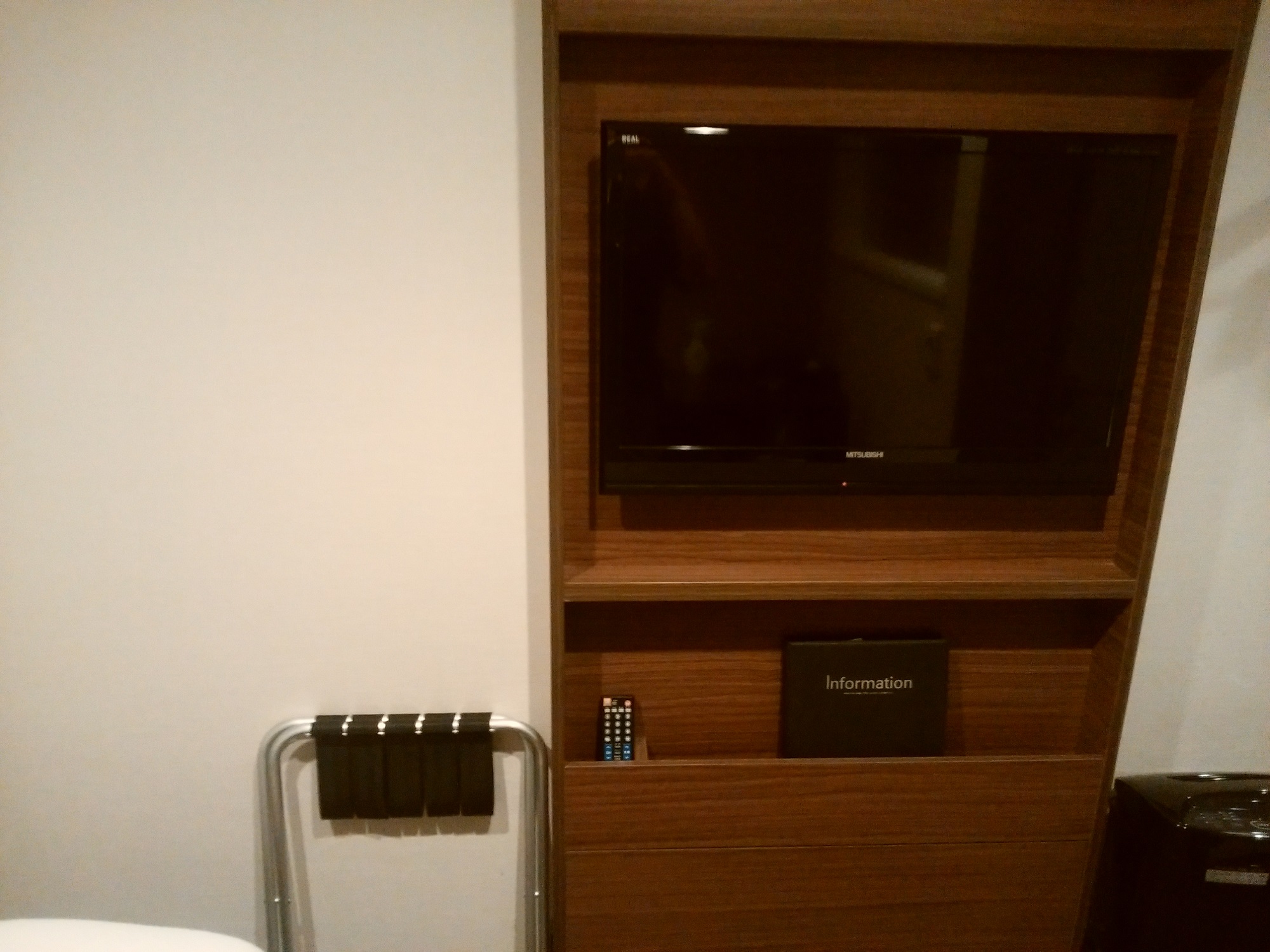 シングルルームです。窓側にベッドがありまして、手前に(・・・て、この写真では見えないのですが)デスクがあるという、ちょっと変わった間取りです。デスクと正反対に、壁掛け式のテレビと、加湿空気清浄機があります。