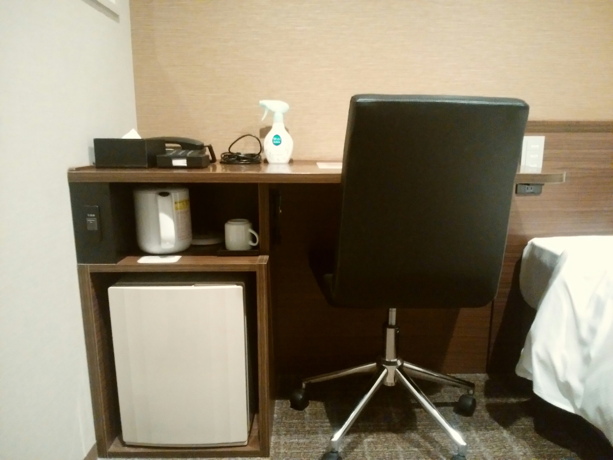 また、電気ケトルとマグカップが置いてあります。お茶のティーバックは置いてありませんでして、フロントの脇に置いてあります。ここから必要なものを持っていくシステムで、なるほどこれはうまい方法を考えたもんだと思いました。