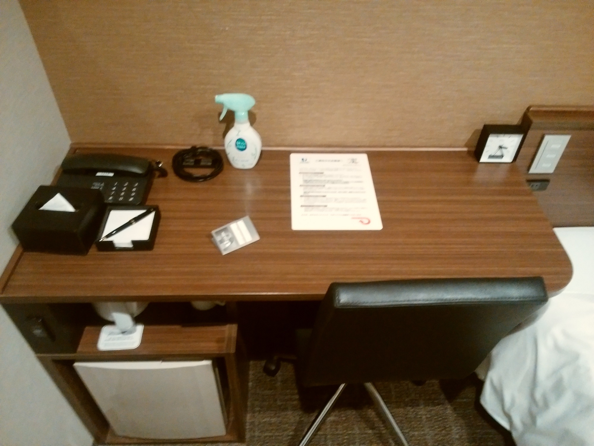 デスク回りがこんな感じ。枕元に、目覚まし時計が置いてあります。また、インターネット接続は有線・無線共に利用可能で、LANケーブルも置いてあります。ACコンセントはデスク上に1つ、枕元に1つと、ちょっと少なめ。気になる人はテーブルタップを持って行ったほうがいいと思います。