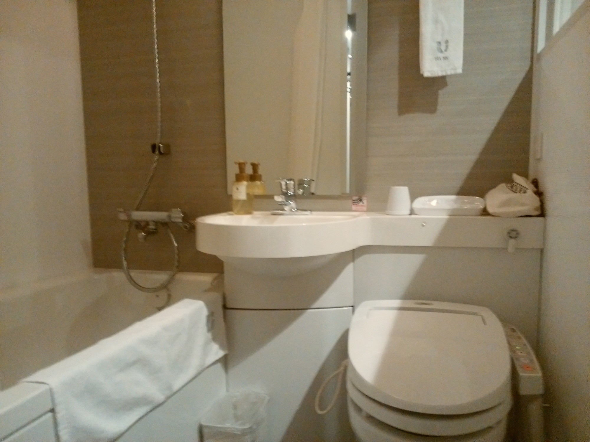 これだけ凝ってるんだからさぞかしお風呂はすごいんだろうと思ったら、さにあらず。湯船は標準的なビジネスホテルの湯舟と同じくらいで、決して広くはありません。なので、ビジネスホテルに泊まり慣れている人ならいざ知らず、