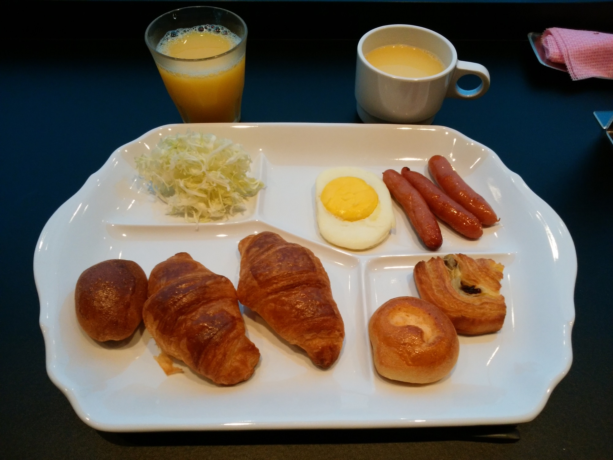 ヴィアイン岡山は、デフォルトで朝食がついてきます。朝食は、焼き立てパンとおにぎりと聞いていたのですが、グレードアップしたらしく、ご飯や色々なおかずがついてくるようになりました。コーンスープもありまして、キューティー吉本的には大満足でしたよ。