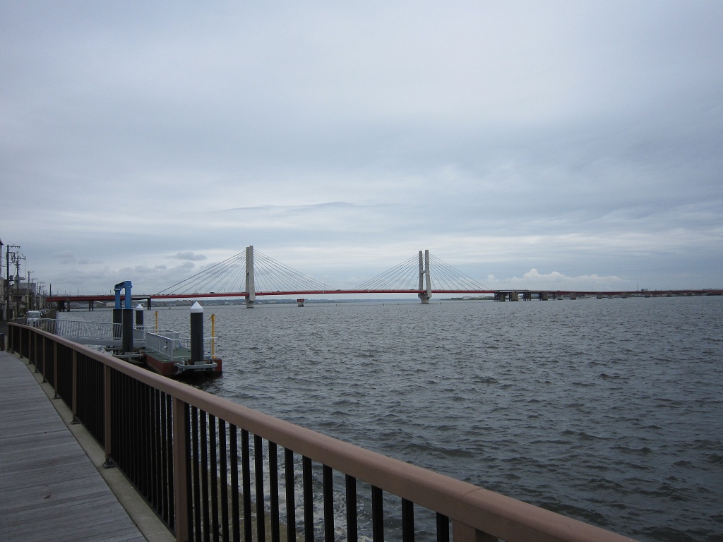 銚子駅から5分ほど歩くと、銚子大橋が見えます。銚子大橋の反対側が、茨城県です。銚子大橋って、昔は割と狭い橋で、反対側から大型トラックが来るとびくびくしながら渡る感じだったんですけど、近年架け替えられまして、余裕をもって渡れる感じになりました。