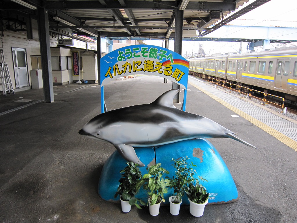 銚子電鉄の電車が来る前に、銚子駅周辺をお散歩です。うーん、さすが本州の東端の銚子、海がきれいですねー・・・と言いたいのですが、この写真は海ではなく、利根川です。ただし、河口付近なので、およそ海なんじゃないかって感じです。