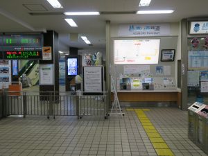 改札口です。自動改札機が並びます。しかし、SuicaなどのICカードは使えません。