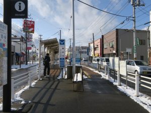 なにしろここは路面電車の電停。両側が道路でして、電停はその真ん中にあります。線路は一本で、両側にホームがあります。