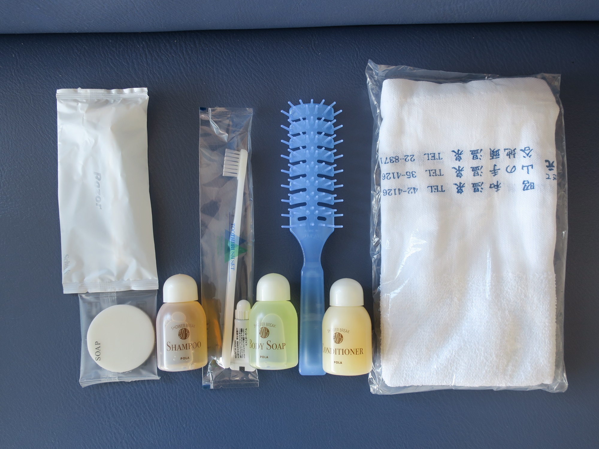 しかし、この中身が謎すぎ。まず、歯ブラシと剃刀って、これ本当に要るんですかねぇ。剃刀はともかく、お風呂で歯を磨く人ってあんまりみたことないんですけど。次に、ブラシってこんなにでっかいのにしないとダメですかねぇ。百歩譲って、くしがあれば十分なんですけど。で、最大の謎は、ボディソープが入っているにもかかわらず、石鹸が入っている点。身体を石鹸で洗って、頭をボディソープで洗う人がいるかも・・・て、いやいや、ちゃんとシャンプーとリンスが入っていますから。