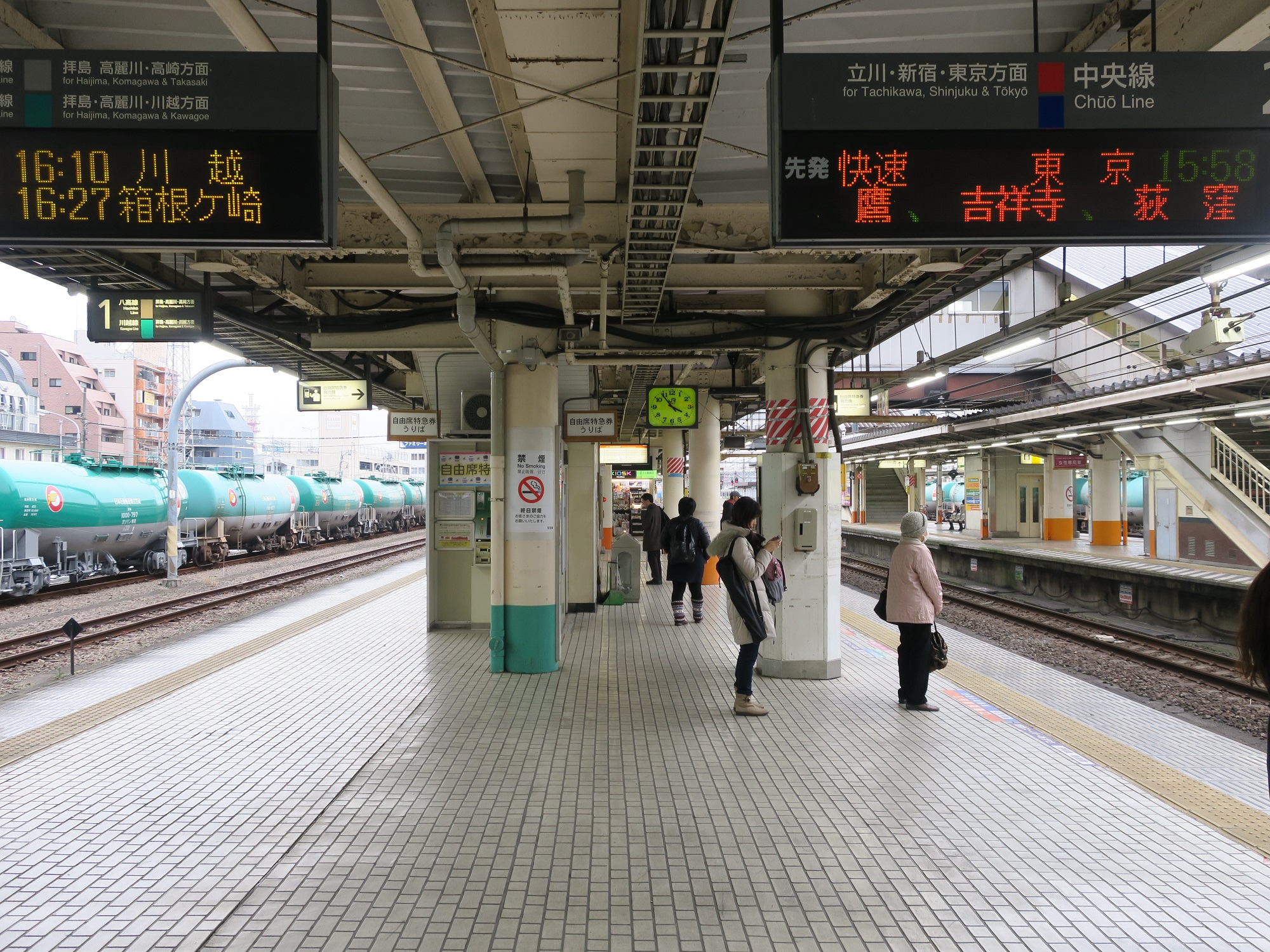 東京の西側の玄関口と言ってもいいぐらいの規模を誇る(そういう意味だと、立川駅もそうか)、八王子駅です。特急あずさかいじの停車駅で、中央線、八高線、横浜線、相模線が乗り入れます。また、ここから歩いて5分ぐらいのところに、京王八王子駅があります。