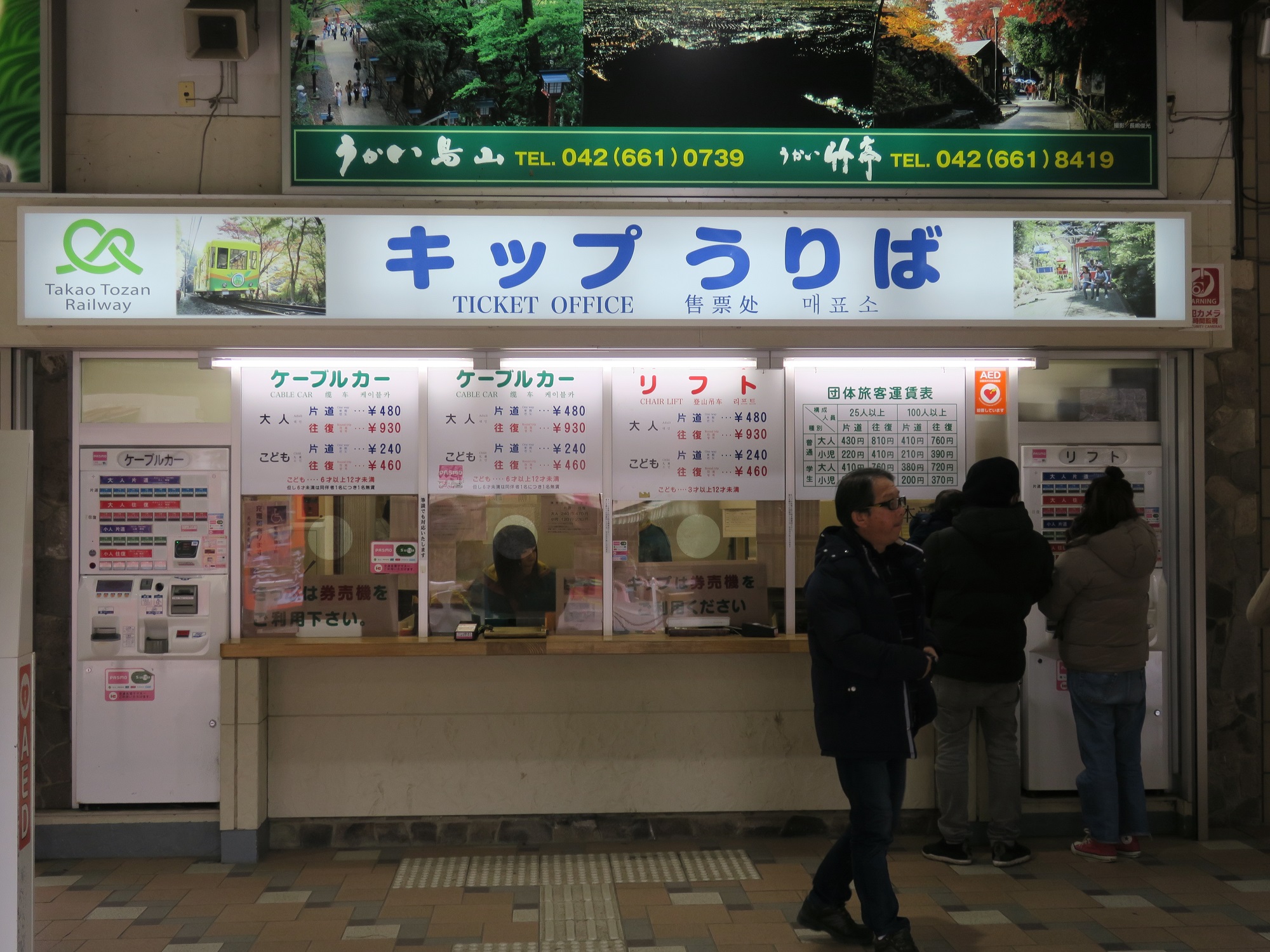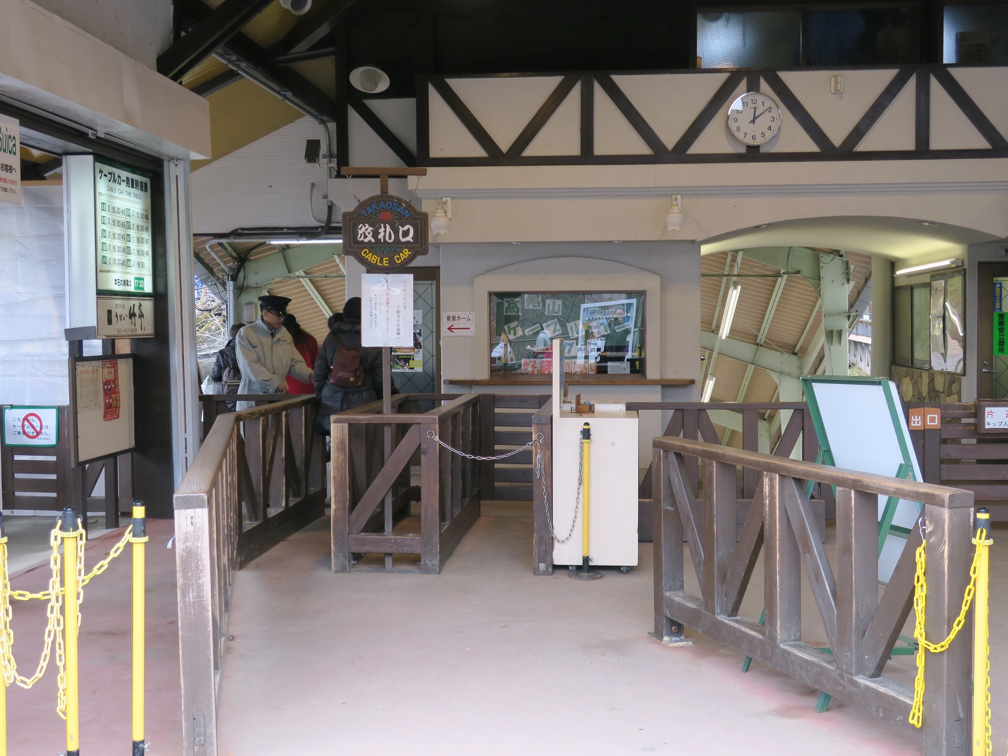 こちらが、高尾山駅の改札口です。余談ですが、ケーブルカーは車掌さんしか乗っていません。運転手さん、つまりケーブルカーを運転する人ははケーブルを巻き上げるところ、つまり山側の駅にいるんですね。