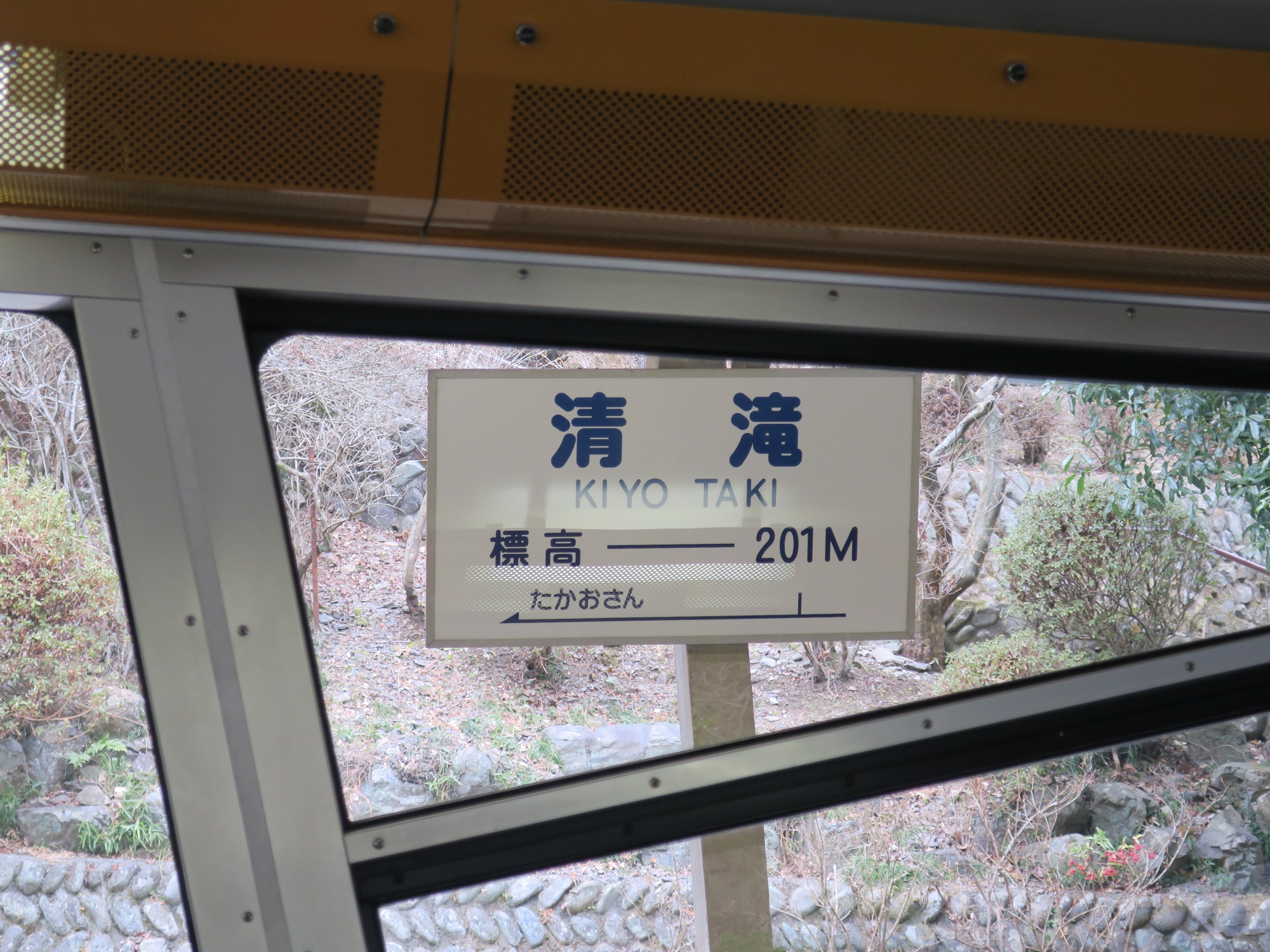 いいところに気づきましたねぇ。はい、窓枠が傾いているんじゃなくて、車両が傾いているんですね。ちなみに、向かって左が山側、右が谷側です。座席は向かい合わせになっているので、清滝駅に止まっているときは、谷側に座っている人はつんのめりそうになります。