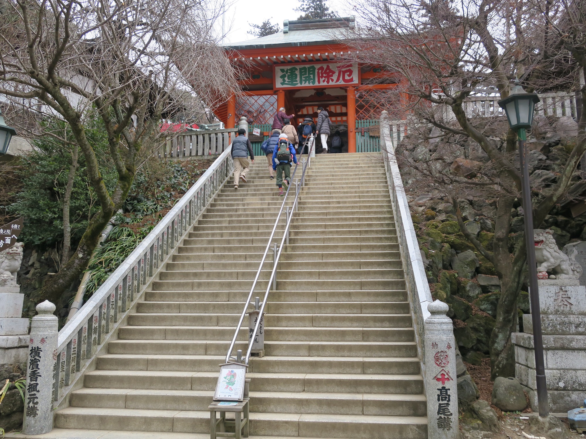 どうせだったら奥の院もみたい・・・が、「高尾山頂方面」と書いた立て看板がありまして、その先は急な石段が。