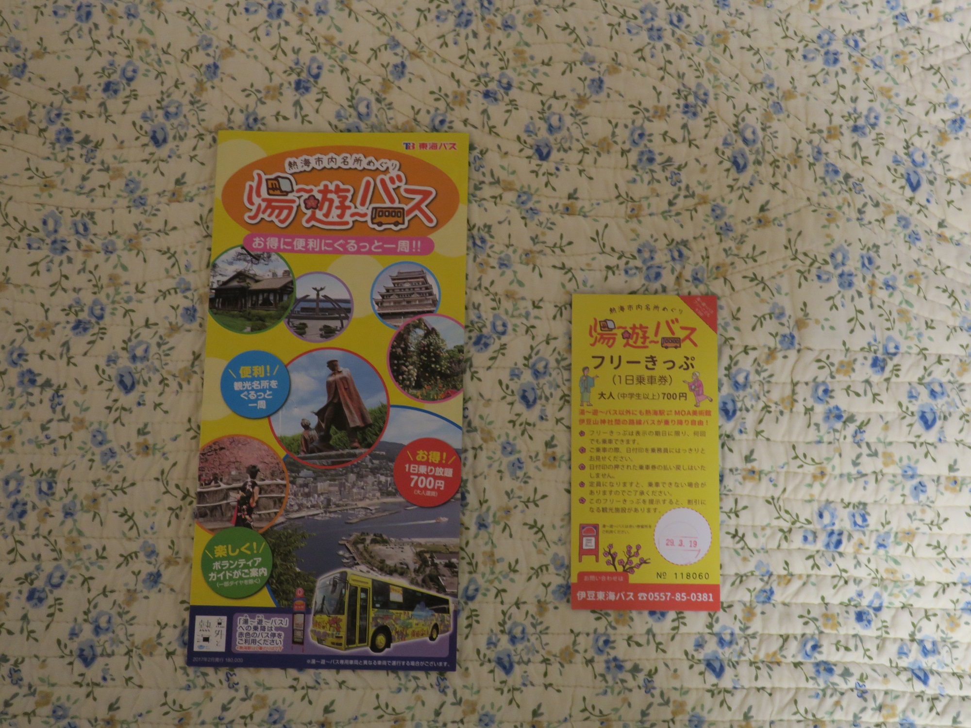 熱海駅に行ったら、湯~遊~バス フリーきっぷを買います。これは、熱海市内の観光名所を巡る、湯~遊~バスが一日乗り放題になるという、一日乗車券です。湯~遊~バスの車内で買えます。料金は、大人700円です。湯~遊~バスは1回乗車で大人250円なので、3回乗れば元が取れる計算です。また、湯~遊~バス フリーきっぷを持っていると入場料が割引になる施設があります。
