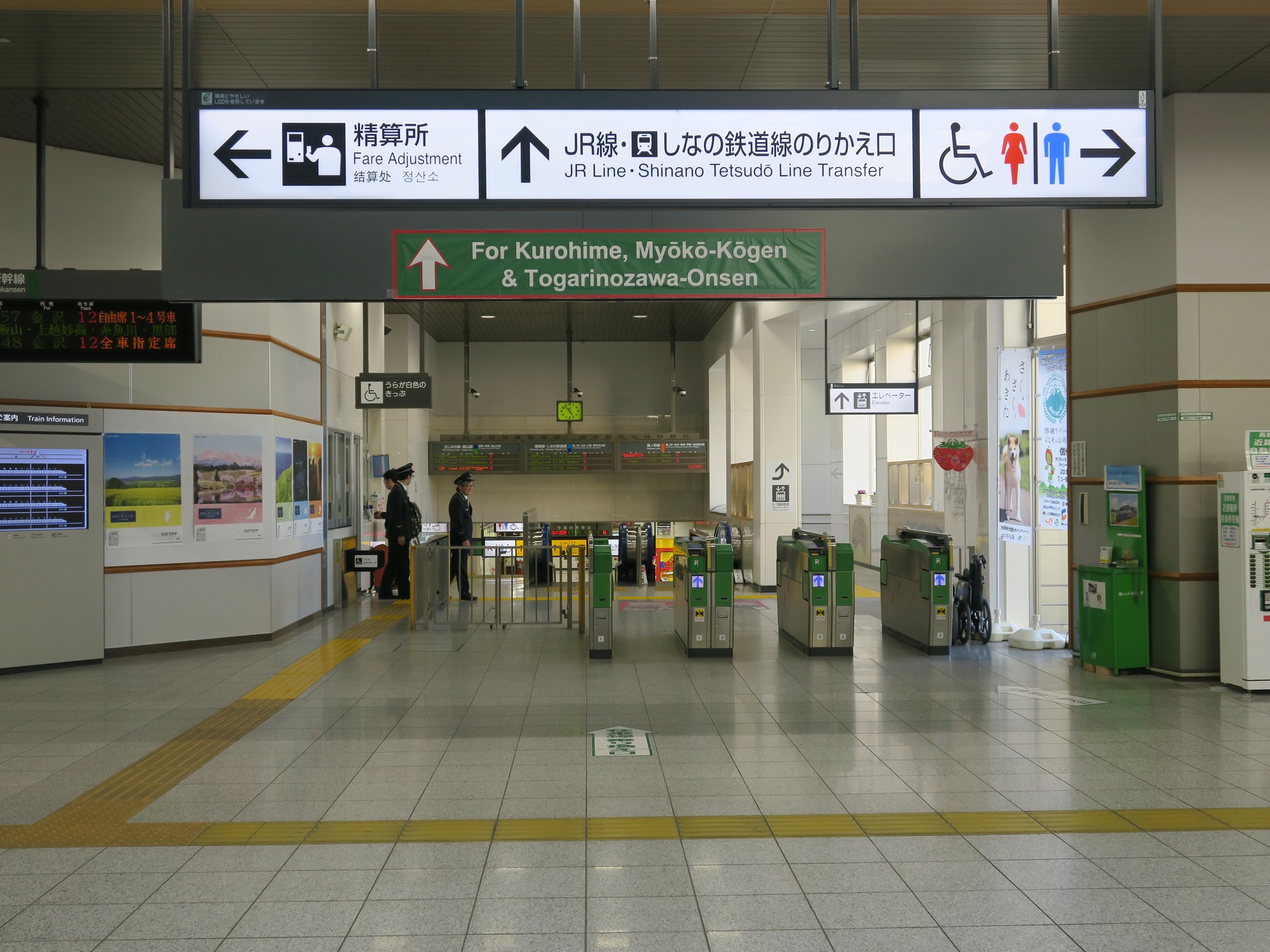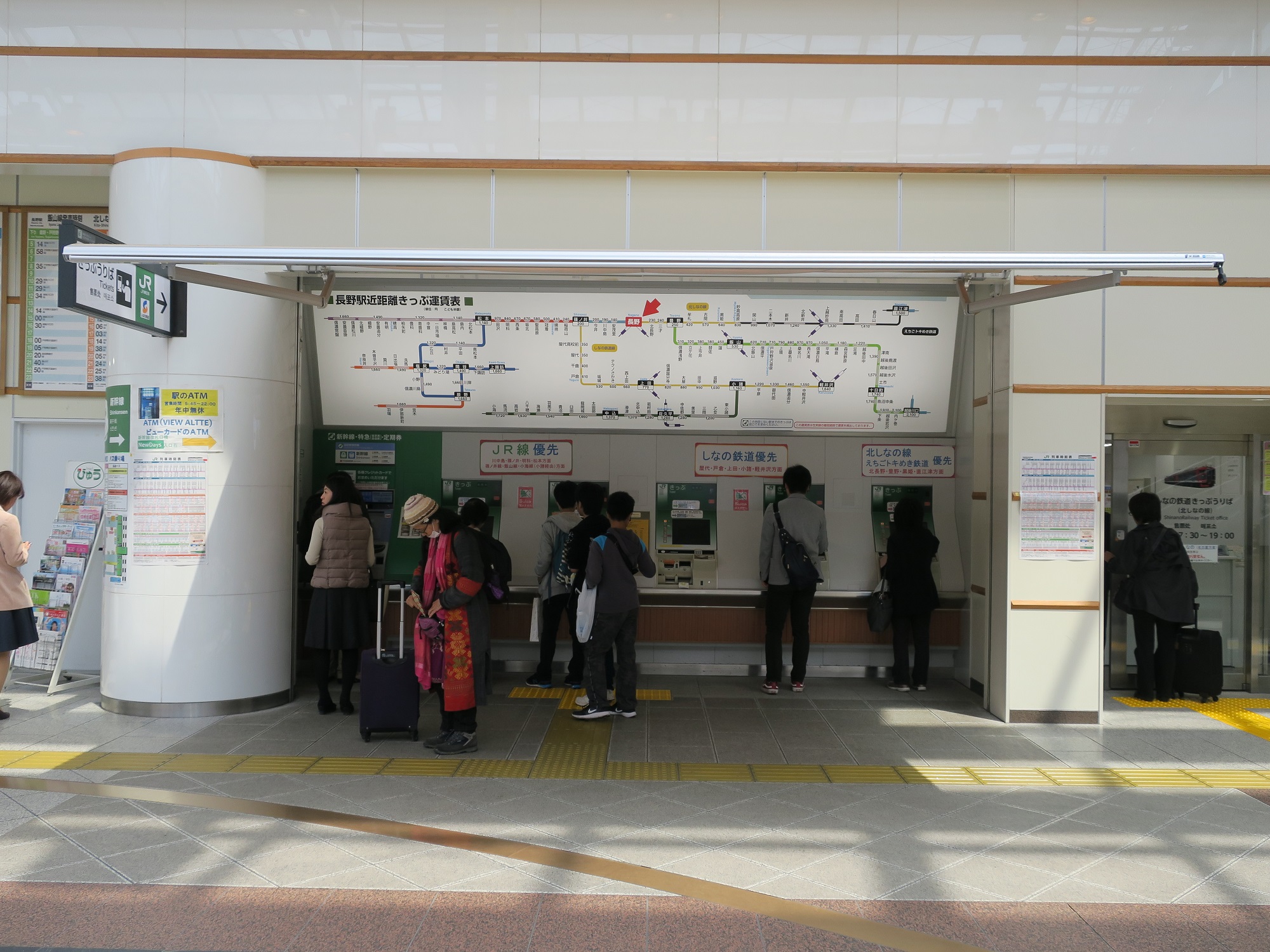 自動券売機です。Suicaが使えないんだったら、さぞ混むんだろうと思ったら、そうでもありませんでした。ただ、「JR優先」「しなの鉄道優先」なんて張り紙がしてありまして、実はこの自動券売機って時間帯によっては混むのかなって勝手に想像していました。