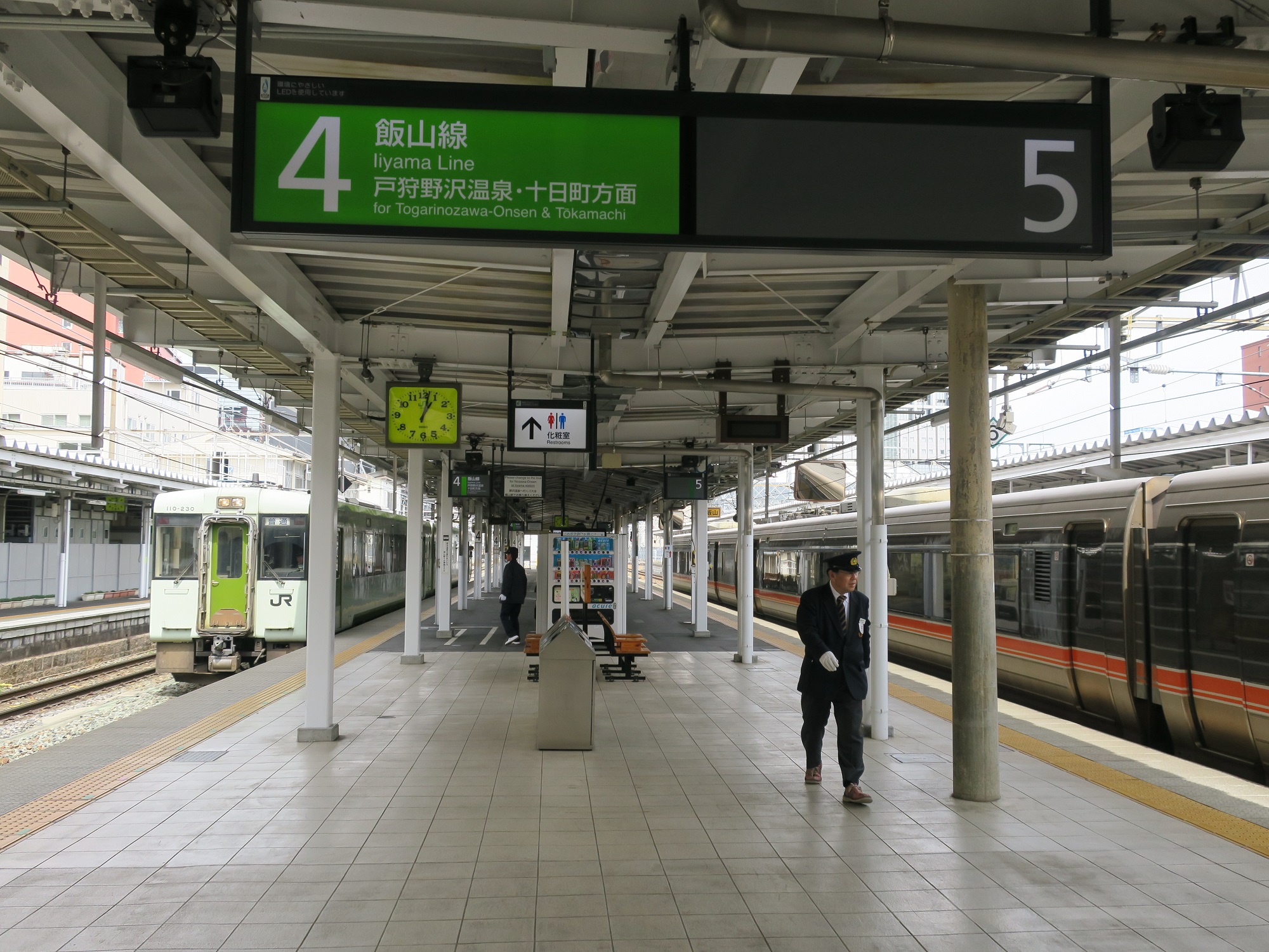 では、4番線はどこにあるのかというと、ホームの端っこにありました。主に飯山線で、戸狩野沢温泉・十日町方面行きの列車が発着します。
