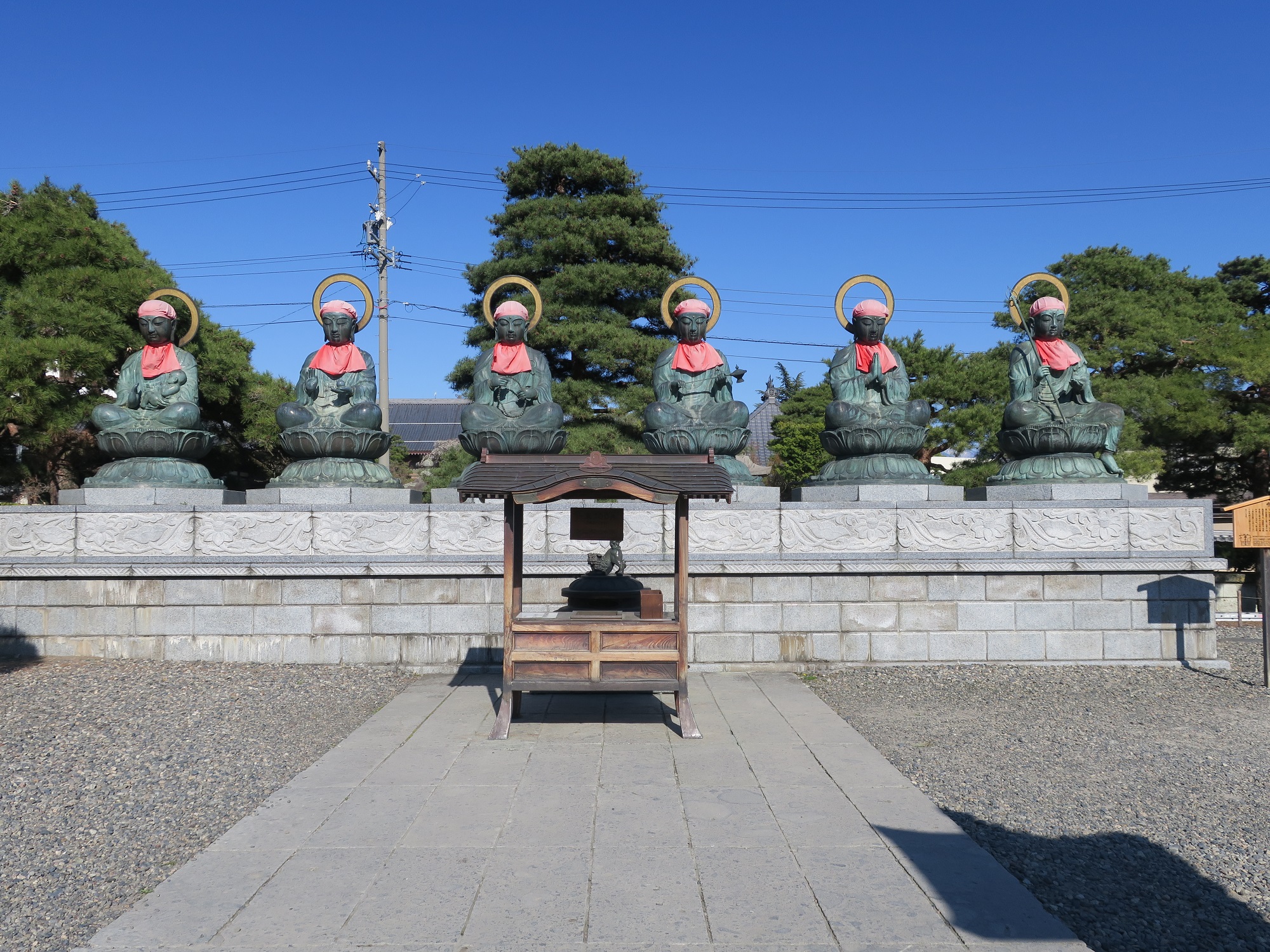 六地蔵です。輪廻を繰り返す6つの世界に現れ、迷いや苦しみから救ってくださる菩薩様です。右から順に、地獄界、餓鬼界、畜生界、修羅界、人界、天界の地蔵菩薩様です。