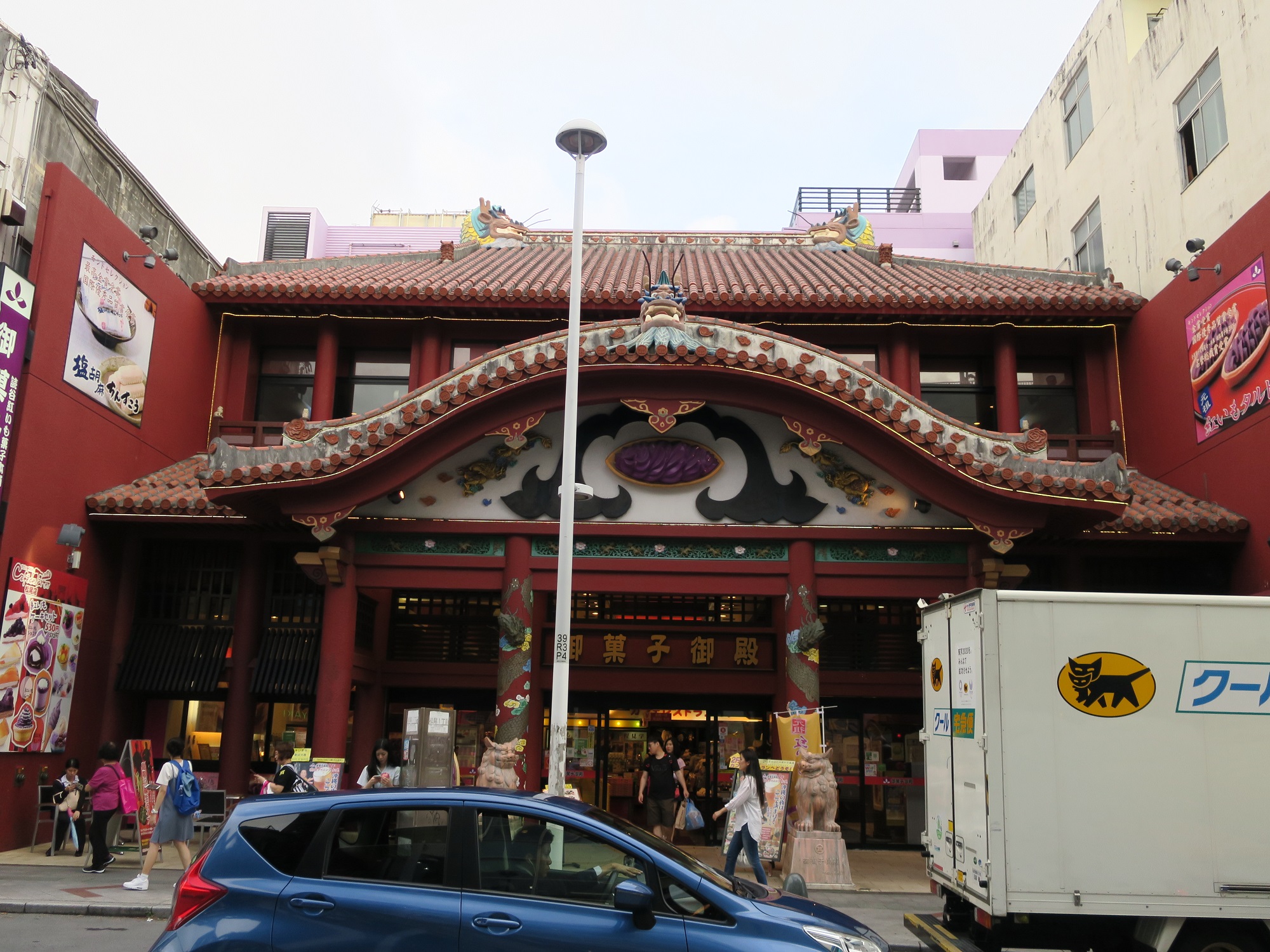 県庁北口交差点からほど近いところに、御菓子御殿があります。国際通りには、お土産物屋さんが数多く並んでいます。