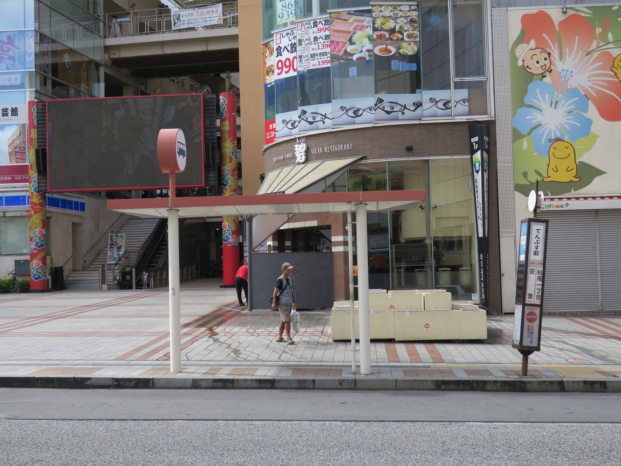 那覇市一の繁華街は国際通りでして、その名の通り、通りなのでバス停は複数あります。どのバス停があるかは、この写真を見るとわかると思います。ちなみに、沖縄県には市外線といって那覇市外へ行くバスも国際通りを走っているのですが、はっきり言って本州では考えられないぐらいの距離を走ります。
