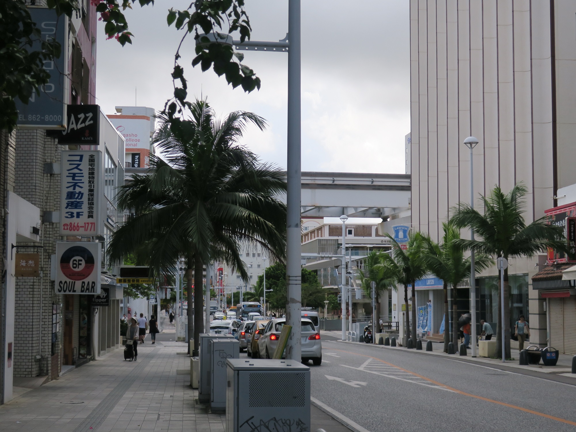 ゆいレールの線路が見えてきました。写真右側のビルの背後に、牧志駅があります。ここが国際通りの繁華街のもう一つの端っこです。