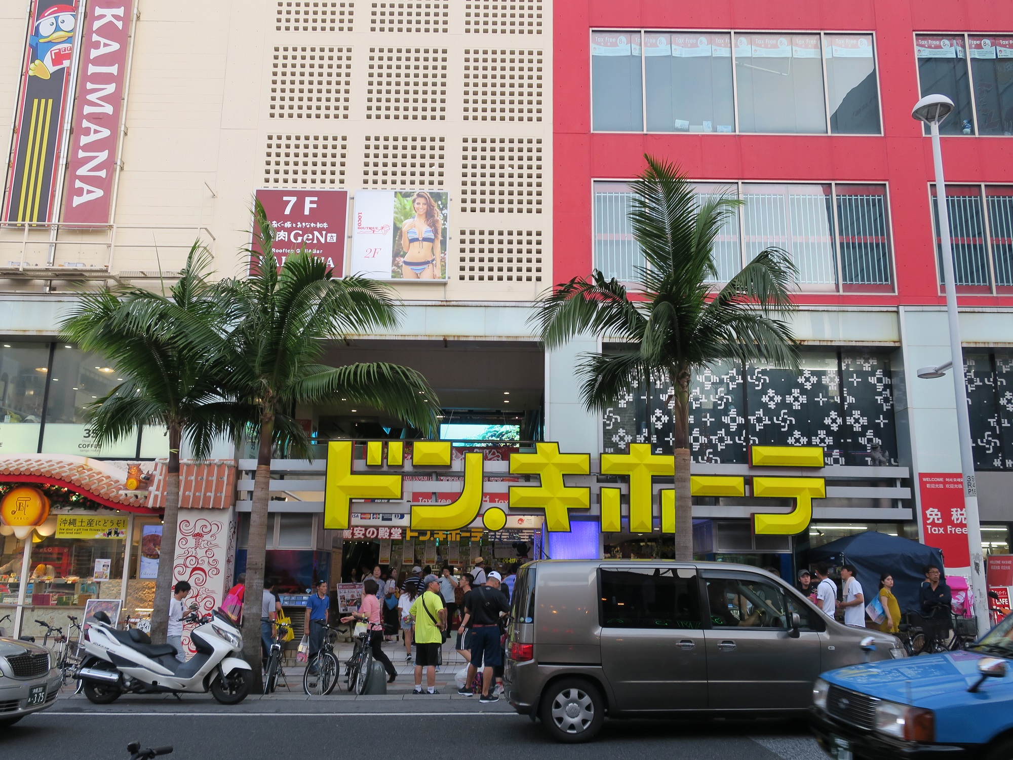 また、お土産物屋さんこそいっぱいあるものの、リウボウを除いて、地元の人たちが買い物に行きそうな場所が見当たりません・・・と思いきや、ドン・キホーテの看板が・・・