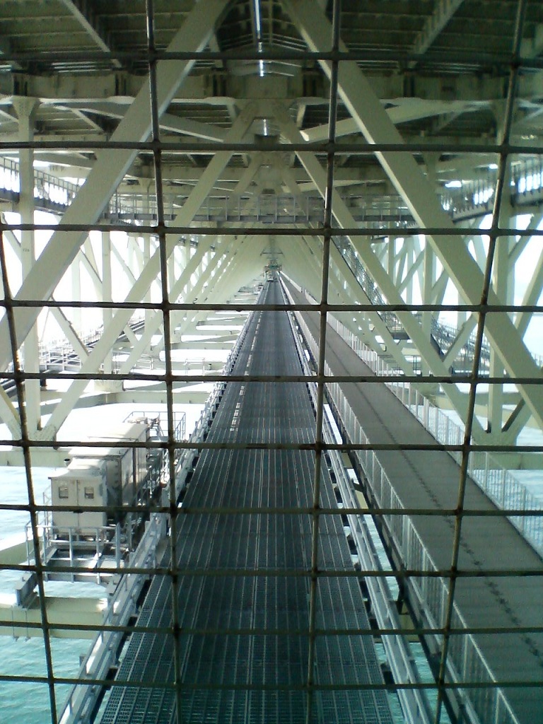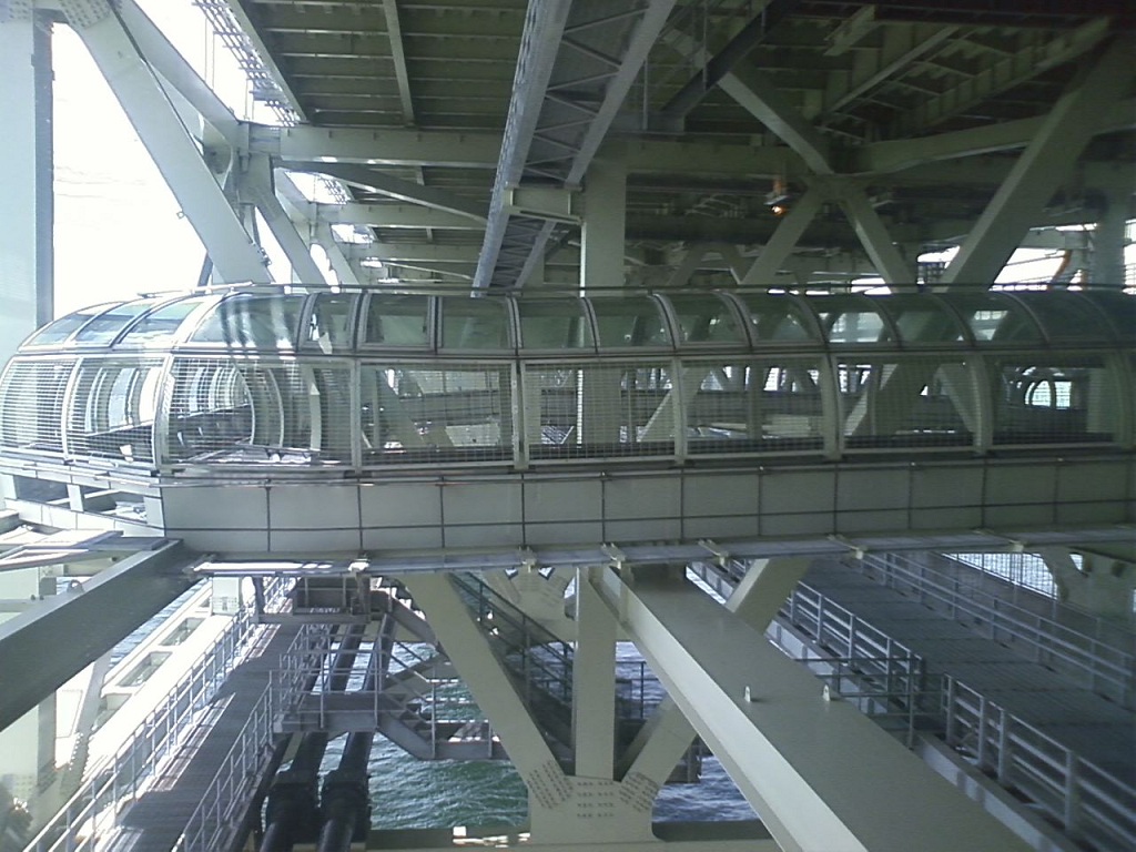 舞子プロムナードの中は、こんな感じ。なんか、チューブのなかを歩いている感じですね。ただし、基本的に金網張りなので、強烈な風が吹き抜けていきます。そりゃあそうですよねぇ。ここは神戸と淡路島の間の、ちょうど狭くなっているところですから。
